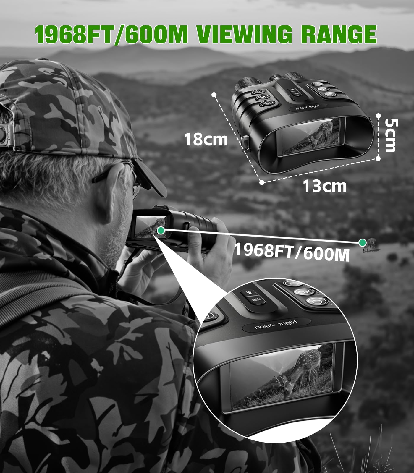 HD Display & Extended Range:3-inch HD screen (360×640 resolution) with exceptional clarity. Built-in microphone and speaker enable audio recording/playback. Digital night vision provides 600m (1,968 ft) night vision range and unlimited daytime viewing.