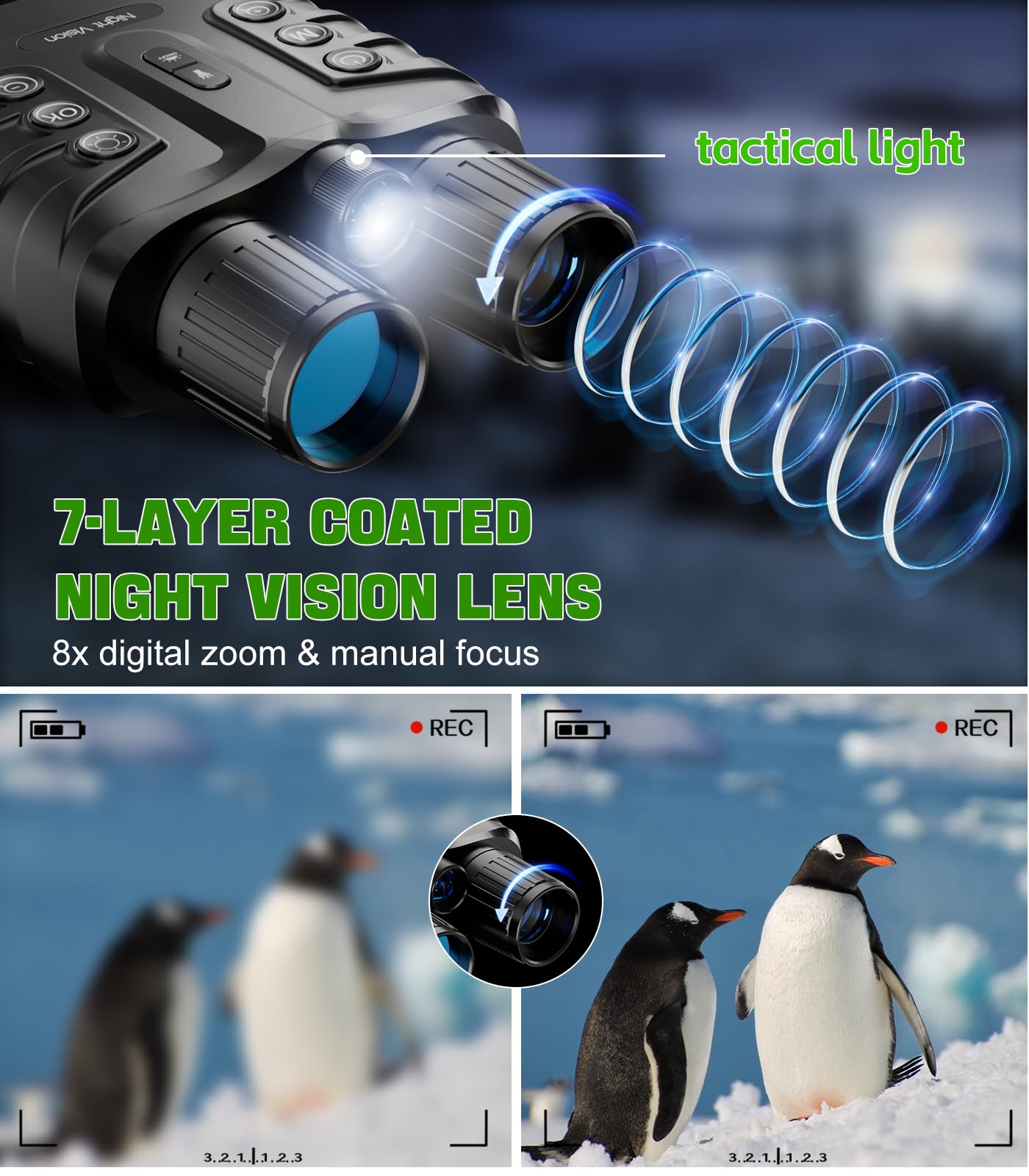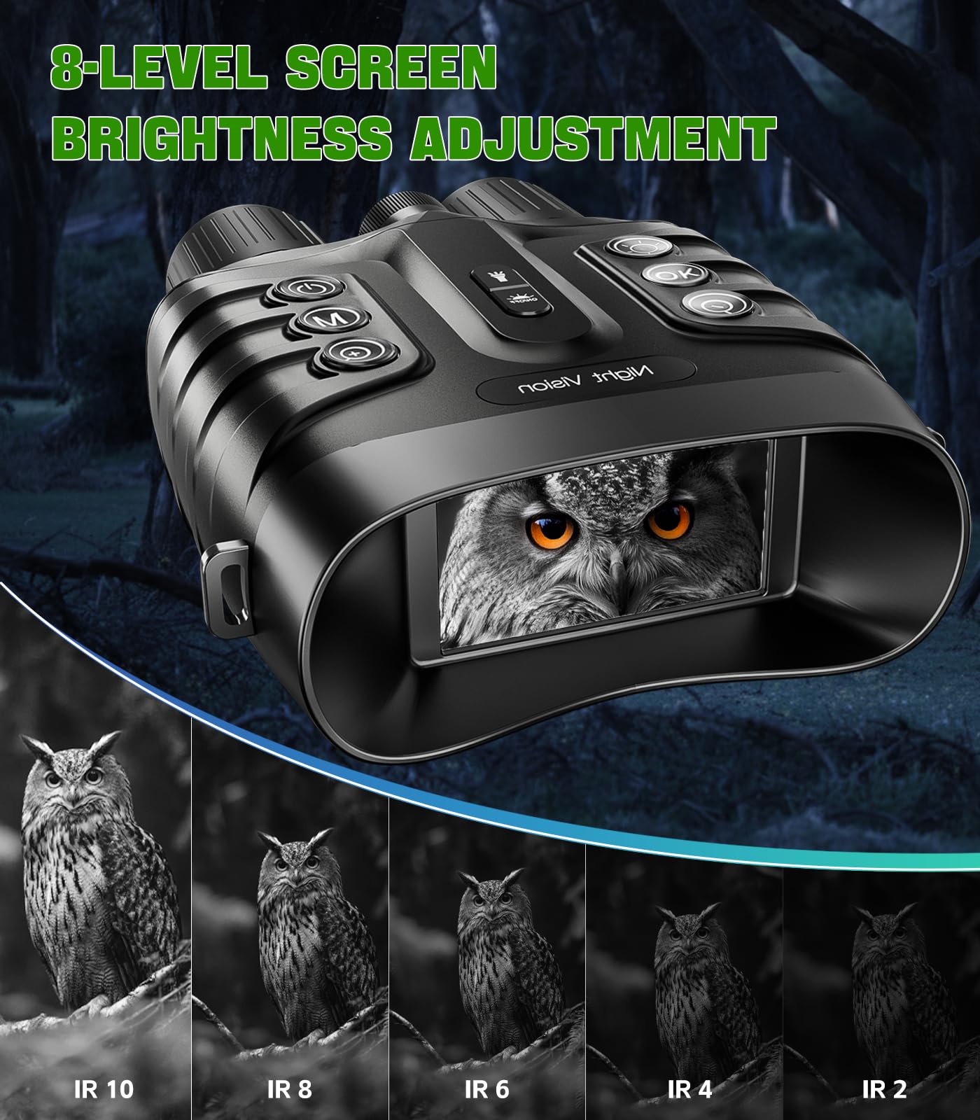 Full Visibility in Darkness:night vision goggles features a 7-layer coated night vision lens with f/1.4 aperture, 25mm focal length, 8x digital zoom, and 3W 850nm IR spotlight. Delivers HD photos/video in daylight, low-light, and total darkness. Backlit buttons ensure effortless operation even in pitch-black conditions.