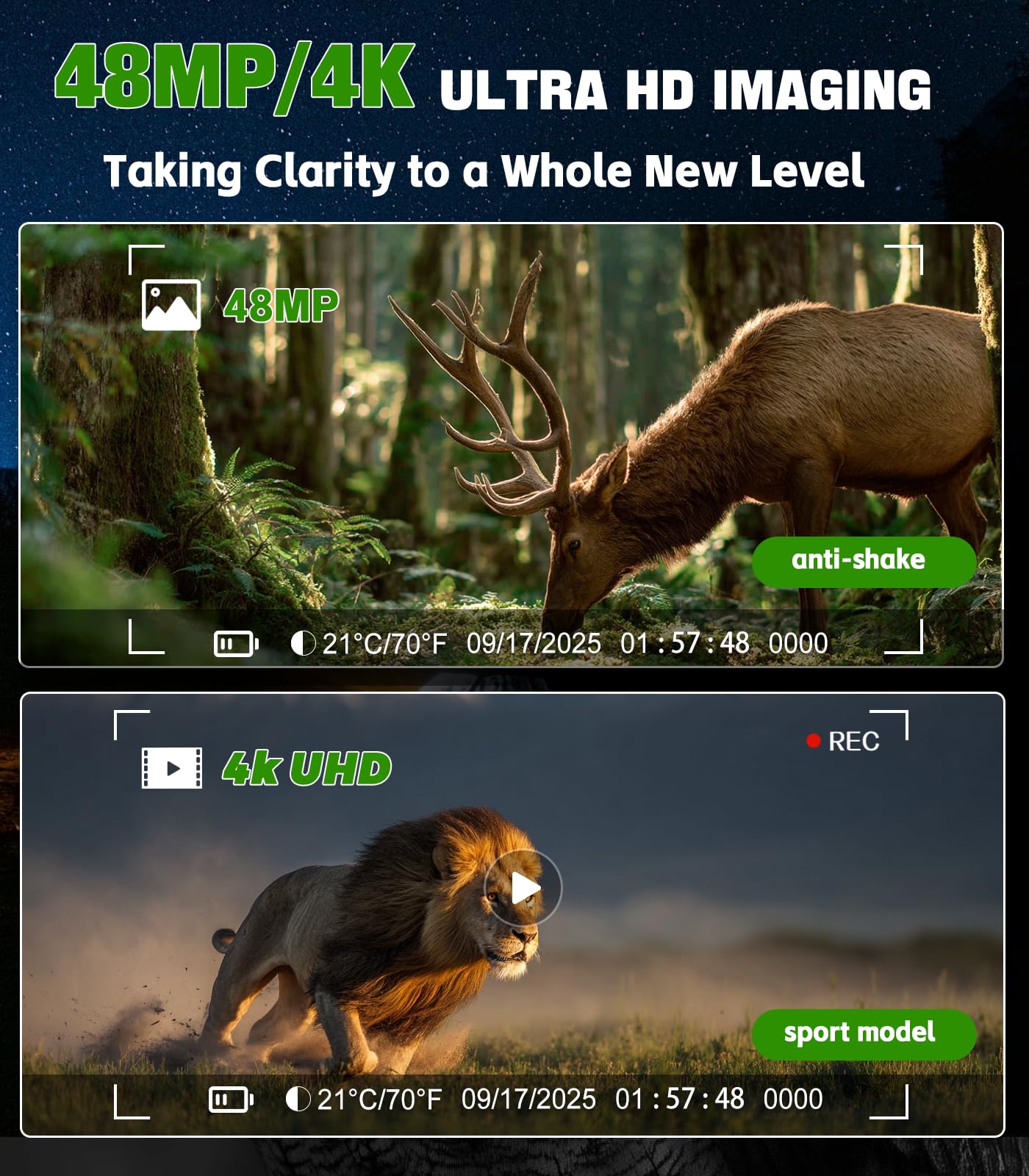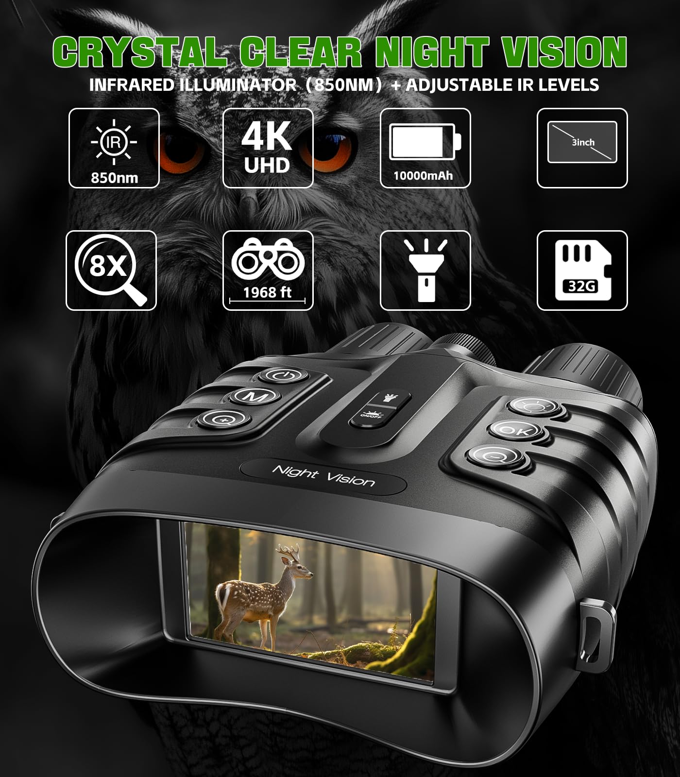 Ultra HD Imaging:night vision binoculars for adults captures 4K video and 48MP photos to preserve nocturnal wonders. Includes 32GB storage (expandable to 128GB) for extended recording capacity.
