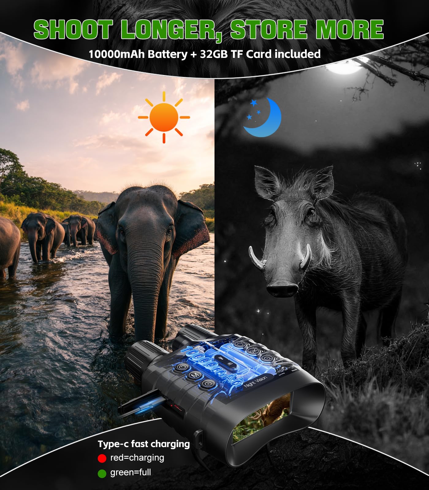 Professional-Grade Endurance:binoculars night vision own 10,000mAh rechargeable battery supports up to 20 hours of continuous recording. Integrated tactical light serves as both illumination and emergency signaling. Type-C fast charging ensures expedition readiness.