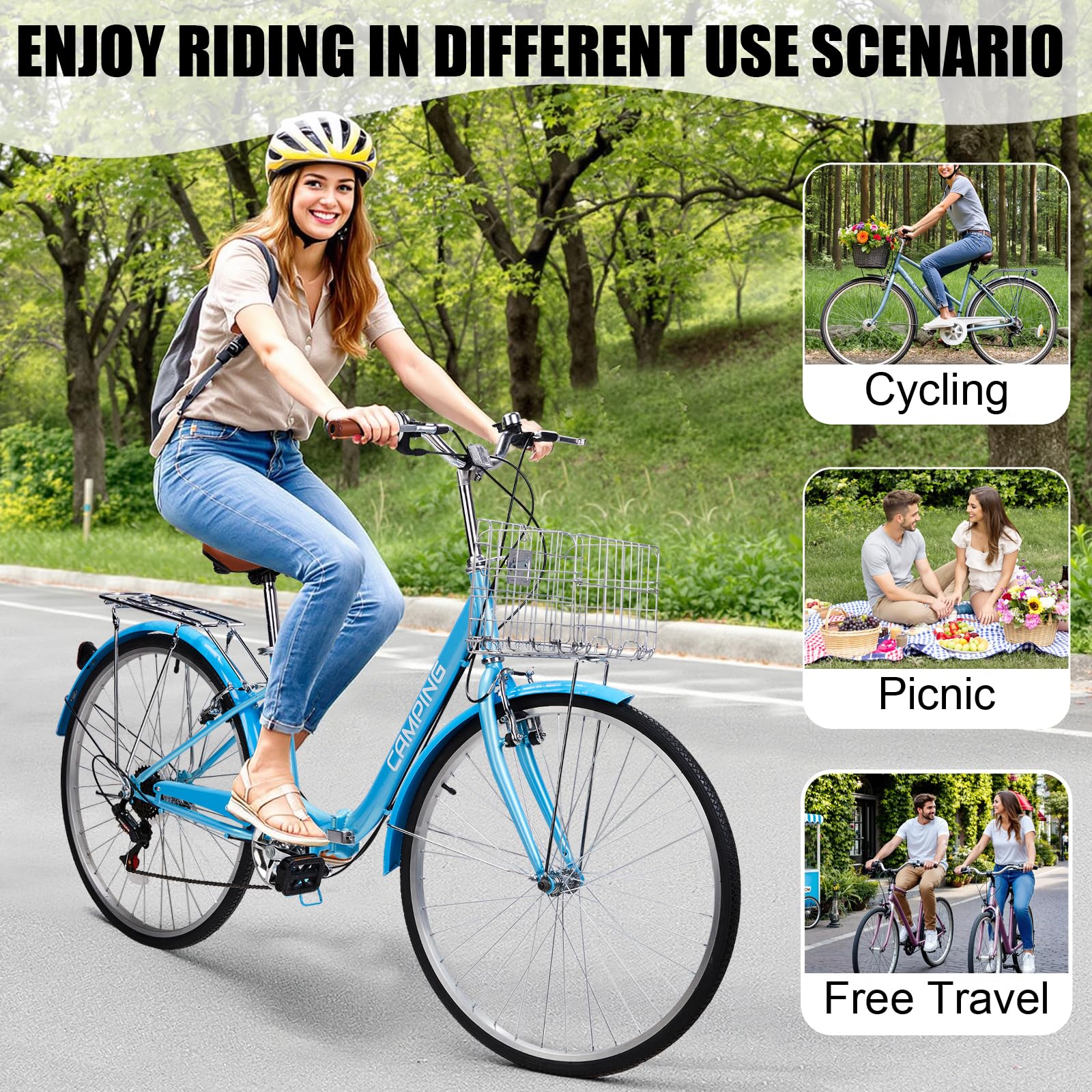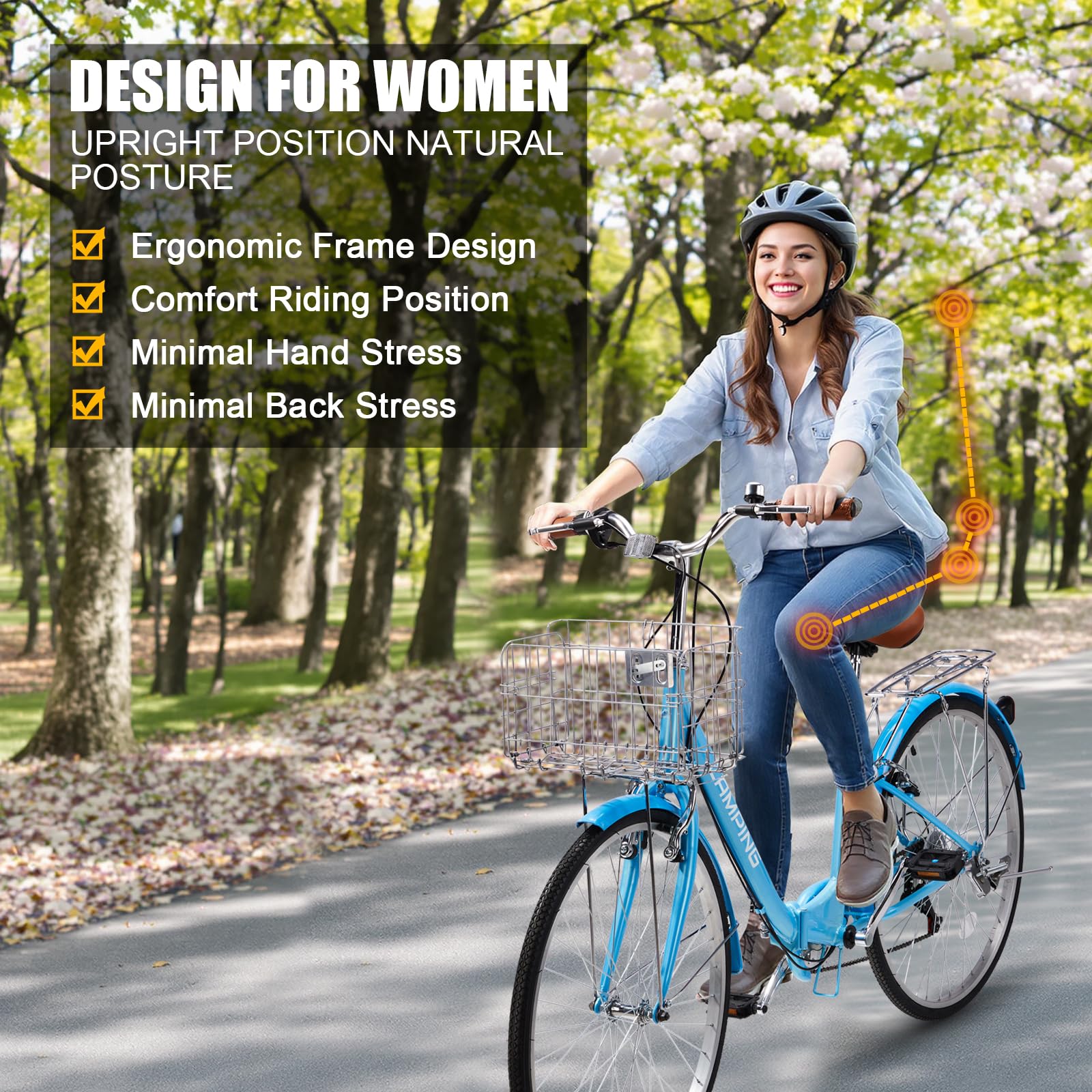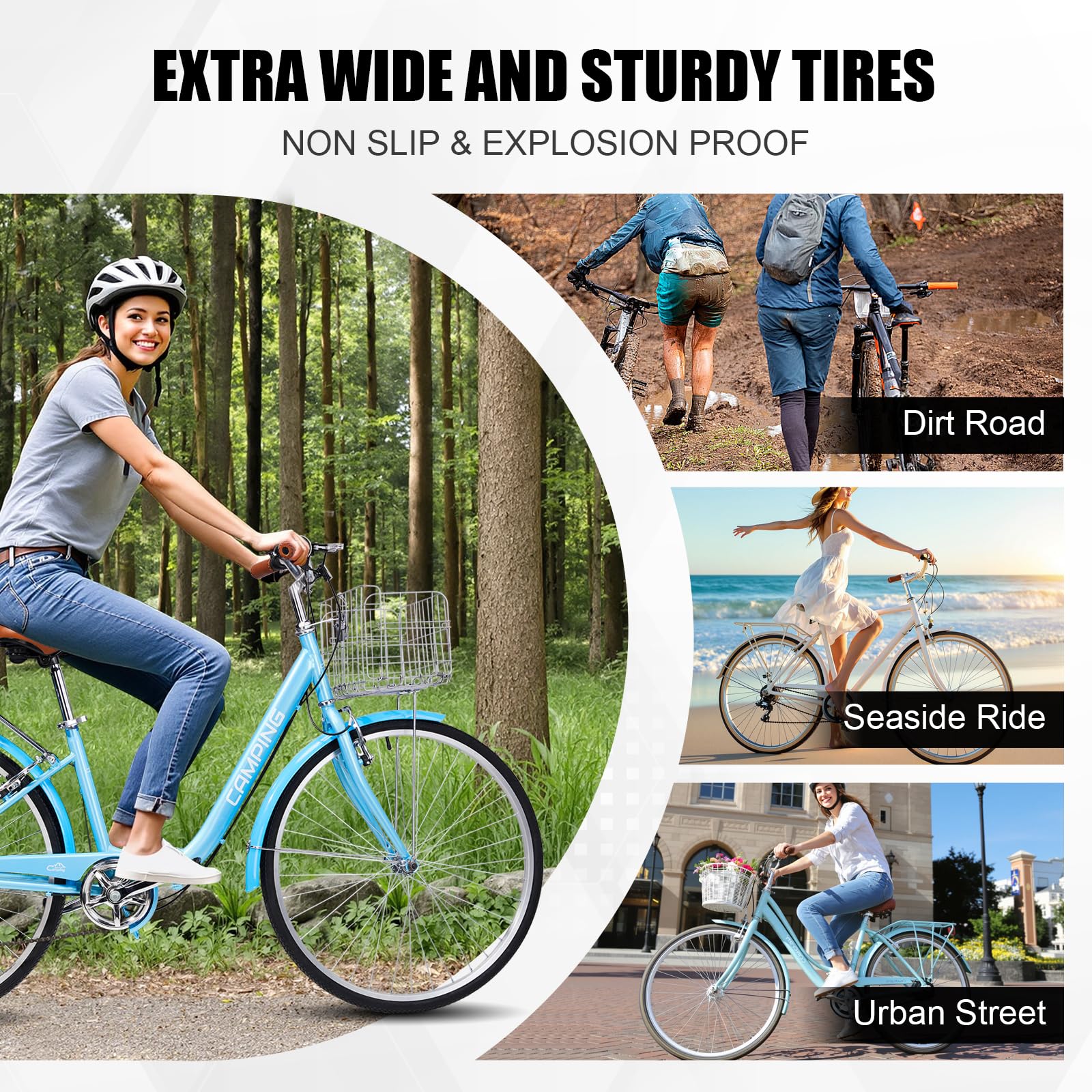 COMFORTABLE RIDING EXPERIENCE: Equipped with lightweight aluminum wheels, this women bike offers a safe and smooth riding. The precise 7-speed transmission system enables seamless gear shifting on hills, streets, or coastal roads. Cruiser handlebars and padded saddle reduce fatigue, perfect for commuting, leisure rides, or weekend adventures