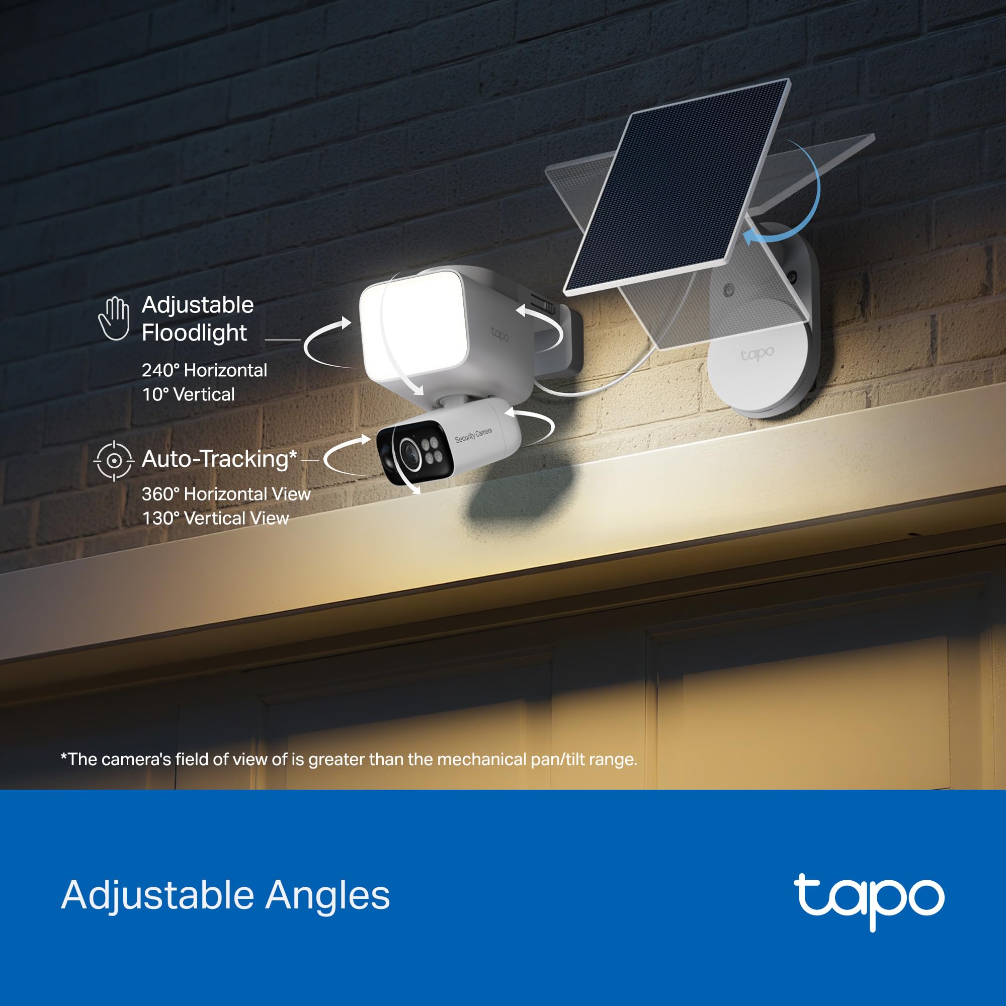 The Tapo C615F KIT is a solar-powered pan/tilt 2K outdoor security camera with an integrated 800-lumen floodlight that can be motion-activated or controlled through the Tapo App. Designed to provide clear visibility for garages, backyards, and front entrances, it combines two built-in spotlights and one main floodlight with a 4000 K color temperature for bright, full-color night vision. An IR night vision mode is also available for discreet, low-light monitoring. Powered by a built-in rechargeable battery paired with the included eco-friendly Tapo A201 solar panel, eliminating the need for wiring or frequent battery changes. The camera features an IP65 weather-resistant design and operates reliably in temperatures from –4 °F to 113 °F and humidity levels between 10% and 90% (non-condensing). The floodlight camera provides a 100° diagonal, 84° horizontal, and 44° vertical field of view, plus a mechanical pan/tilt range of 338° pan and 97° tilt for up to 360° horizontal and 130° vertical coverage. The floodlight itself can be manually adjusted 240° horizontally and 10° vertically. You can schedule automatic 360° scans for full panoramic coverage or patrol key points at set times, while the camera detects motion up to 32 feet away at its highest sensitivity. For active security, the C615F includes a built-in 97 dB siren and bright alarm lights that can be customized to trigger when motion is detected, helping deter unwanted visitors. It connects securely with WPA/WPA2-PSK protocols and is compatible with Tapo H500 and H200 hubs. Certified to CE, FCC, NCC, BSMI, JFT, VCCI, DOE, CEC, NTRA, KC, and RCM standards, the camera measures 5.23 × 3.22 × 6.34 inches and weighs about 1.5 lbs, while the included solar panel measures 6.82 × 4.74 × 0.61 inches and weighs about 0.37 lbs. The kit includes the Tapo C615F camera, Tapo A201 solar panel and bracket, base cover, USB charging and solar extension cables, mounting screws and anchors, template stickers, and a quick start guide. *Data based on the comparison between Tapo C615F KIT and Tapo C610 KIT in a laboratory environment. Actual illumination may vary based on environmental conditions. §45 min of sunlight time is based on standard environmental conditions (1000W/m2, 25°C, AM1.5) and specified working scenes (up to 100 events triggered per day). Actual required time of sunlight may vary. △140-day battery life is based on Tapo laboratory tests with 300 seconds of use per day. Increased usage per day reduces battery life. Actual battery life may vary due to device settings, usage, router specifications, and environmental factors. ◇The number of automatic 360° scans and recordings is limited per day. **24/7 Capture must be enabled in the Tapo App and is only available when storing video locally. When no motion is detected, 24/7 Capture allows battery-powered cameras to capture images at customizable intervals—every 1s, 5s, 10s, or up to 60s—ensuring continuous monitoring while conserving battery life. Once motion is detected, the camera automatically switches to standard recording mode, helping reduce missed events and false alerts. ⌂microSD card purchased separately. Actual storage capacity depends on the size of the microSD card used. ***Subscribe for cloud storage at https://www.tapo.com/tapocare/. Streaming via Google limited to display on Chromecast & Nest devices only.