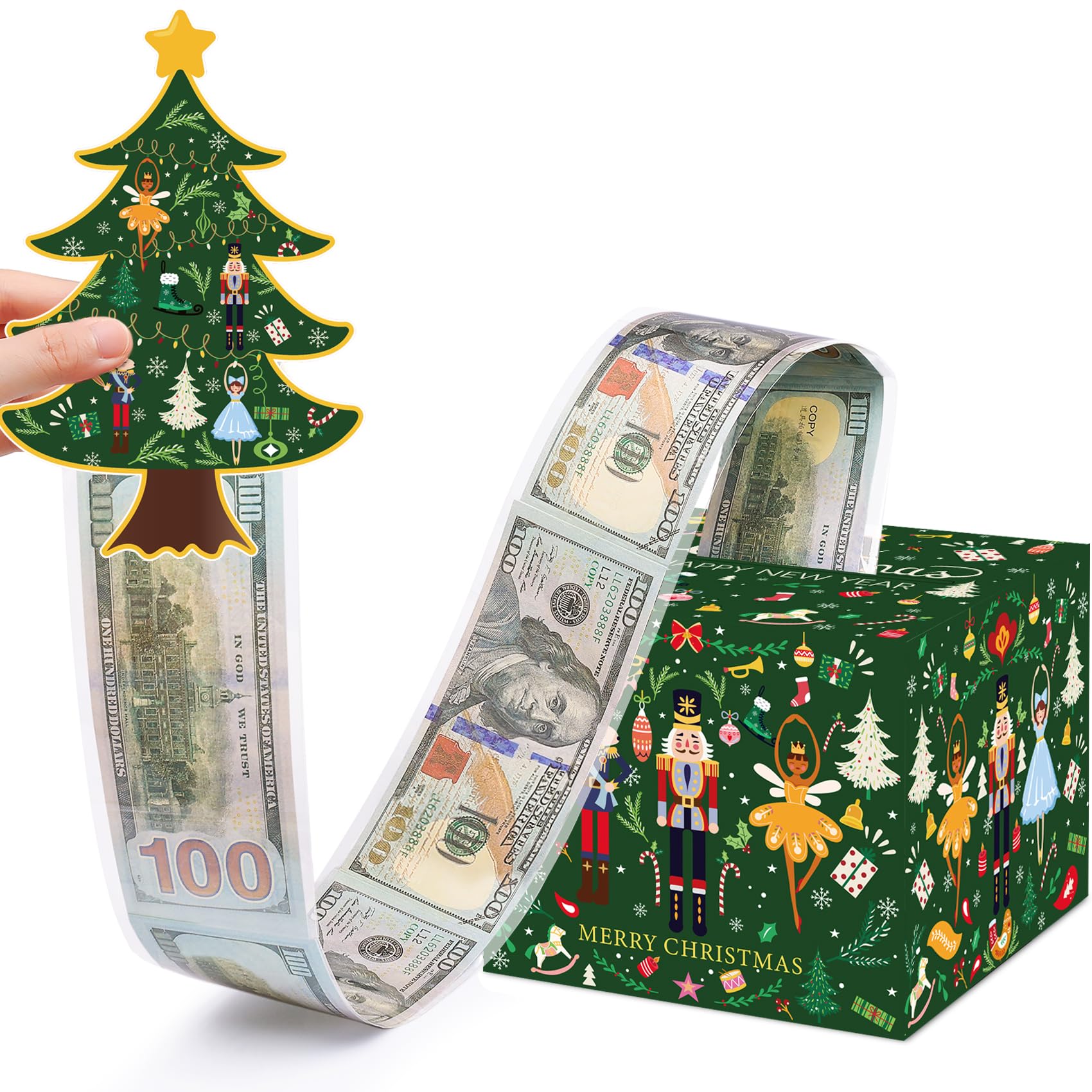 đ ăPerfect Christmas Money Pull Box DesignăThe Christmas Money Box measures 4.3 "x 5.3" x 5.3 "and is made of sturdy cardboard with a Marry Christmas theme pattern. The inside of the cute "Christmas tree" card has tape to secure the money roll. The plastic bag size is 3.15" x 7.89 "(US dollars size: 2.61" x 6.14 "), and 50 plastic bags are enough to accommodate the amount of US dollars you want to customize. This is not only a surprise gift, but also an elegant way to give cash
