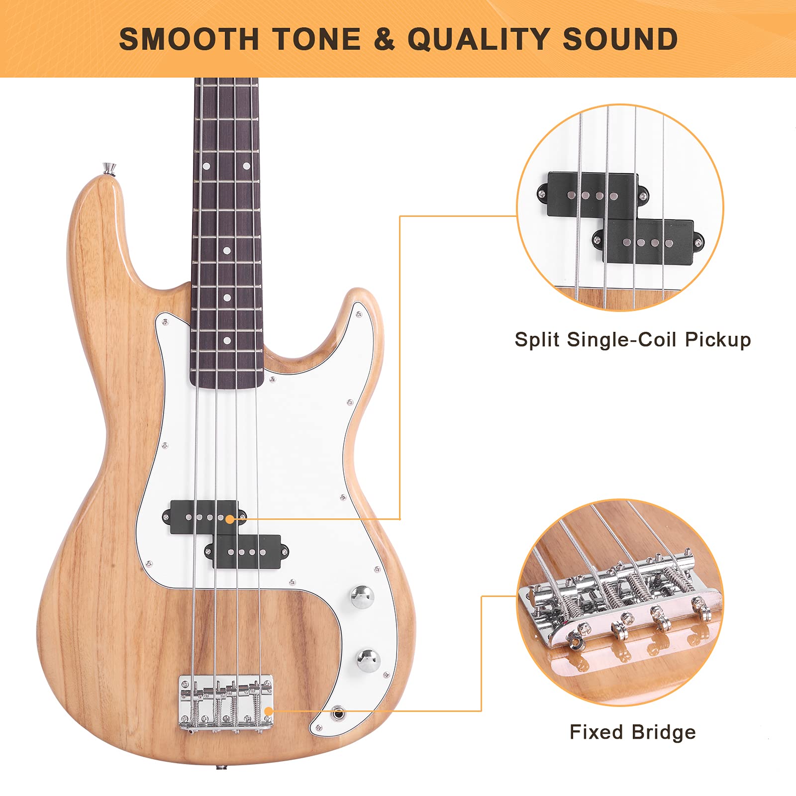 STABLE QUALITY & GREAT FEELINGS: The 4 string bass guitar is made of high-quality basswood on body and stable rosewood on bridge and fingerboard. The ergonomic cut surface of the full size bass guitar and 20-fert provides a fantastic fret-hand feel when you play.