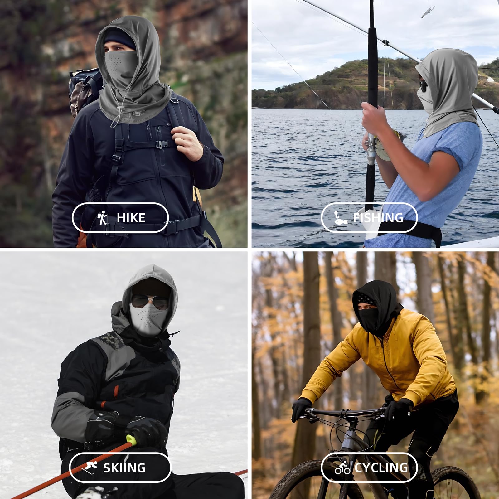 Functional Use: This sun full head mask can well protect your head, face and neck from sun UV, wind and dust. It's great for a day of fishing, sailing, hiking, traveling, boating, climbing, walking, bike riding, skating, jogging, running, motorcycling, workout and any other of your favorite active sports.