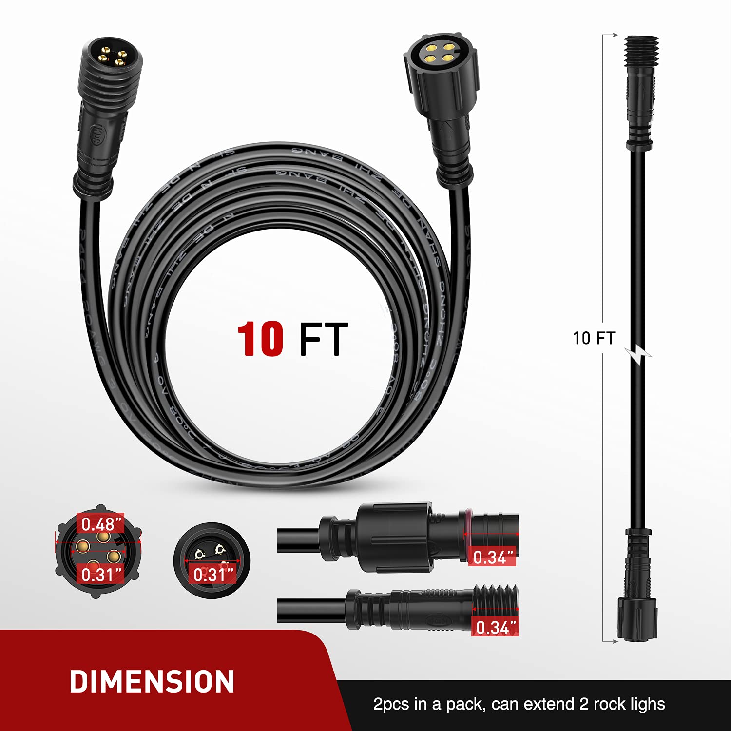 Easy Installation: Just plug and play with female connector on controller box wire and male connector on rock light wire, perfect match without issue. Package Include: 2PCS 10FT Extension Wire