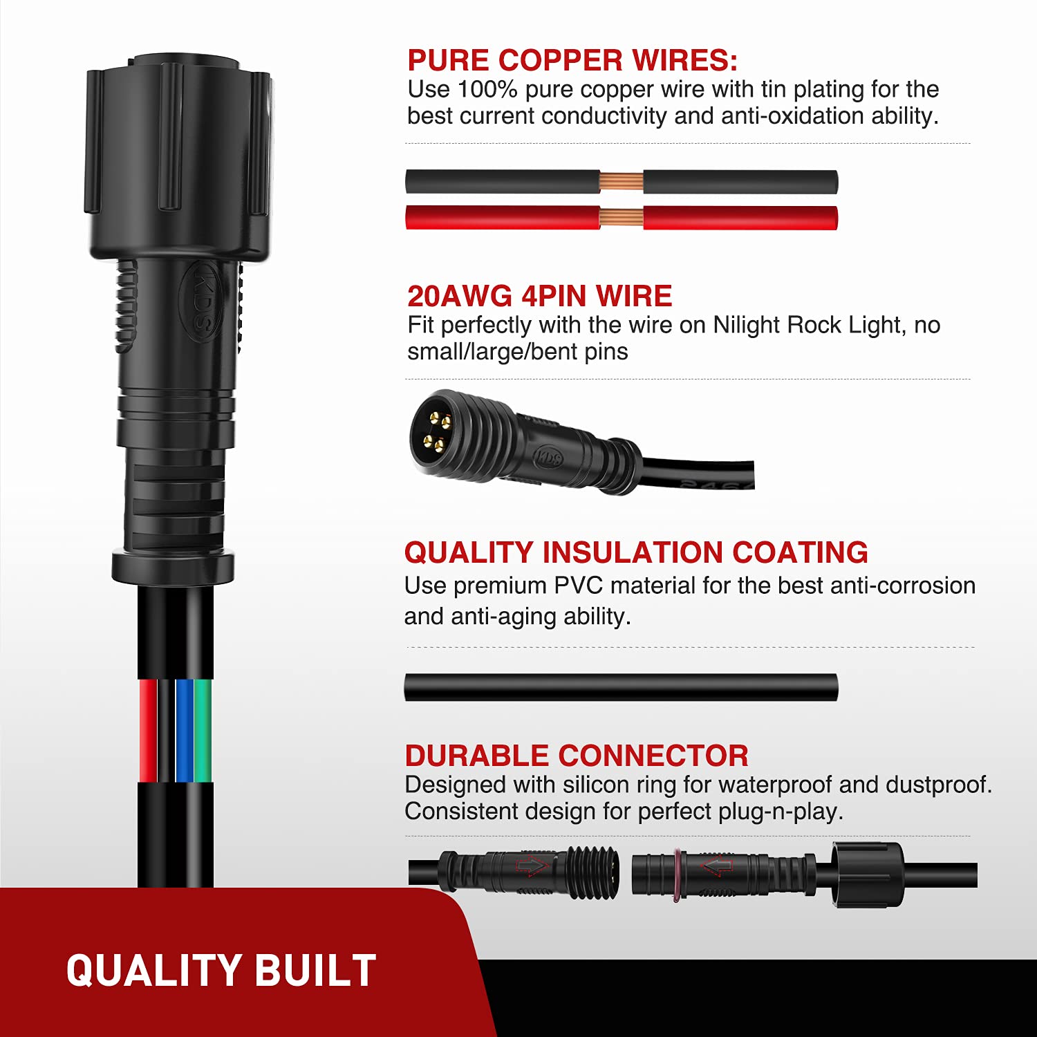 Specification: Wire Length: 10ft; Wire Gauge: 20AWG ( each wire pin inside) Male to Female: 4Pin Material: 100% copper with tin plating , quality pvc housing Fitment: Nilight 4 and 8 pods RGB rock light kits, ASIN: B01MG5UXV4 and B08KF88G32. Note: For not 4 prong RGB rock lights,our rock light extension cable will not fit. For 4 prong RGB rock lights not from us, you can carefully check and compare details of both male & female connector on our wire and one your light kit, including pin thickness, length, hole size, notch position etc. to confirm the compatibility. If you can not confirm the compatibility, just contact us for help.