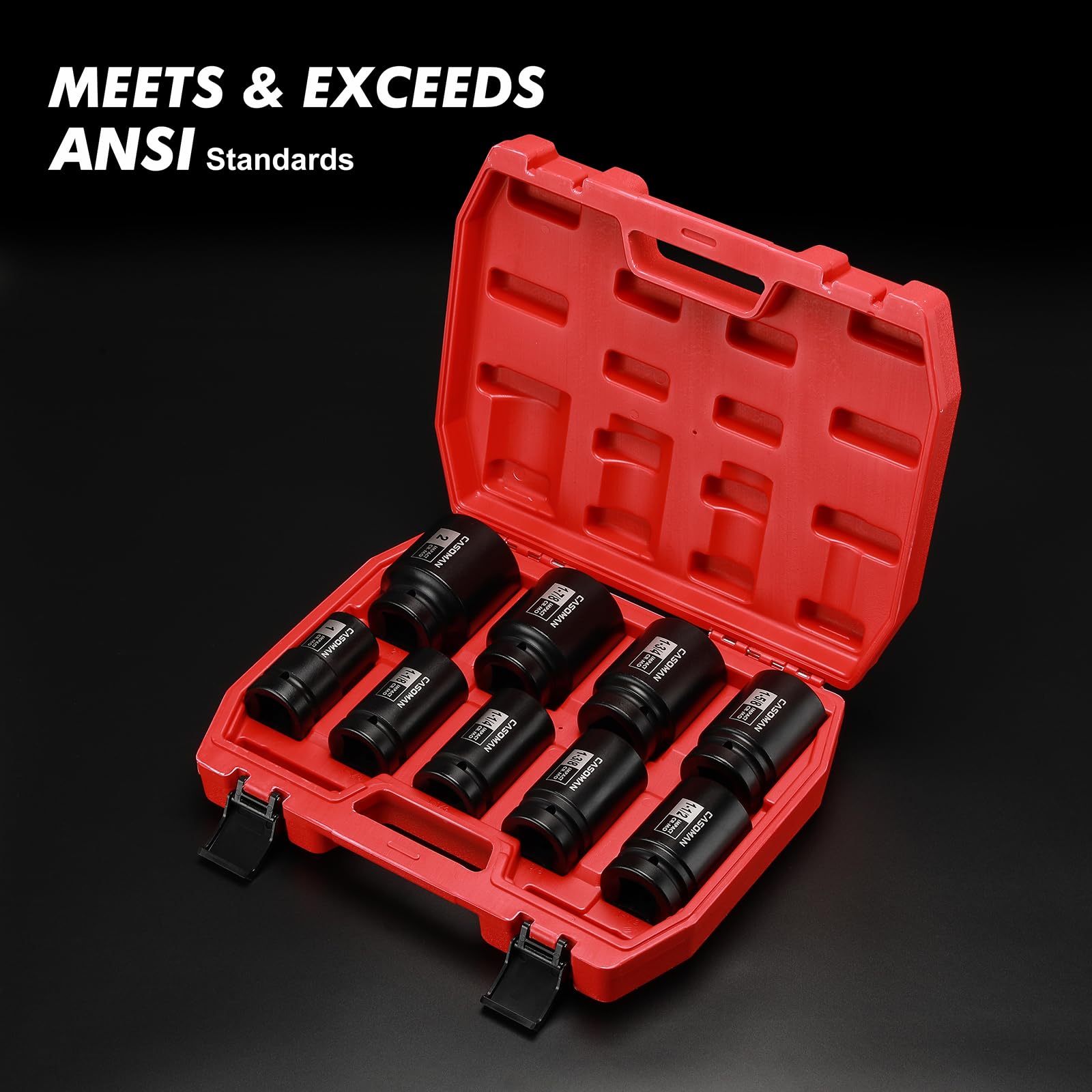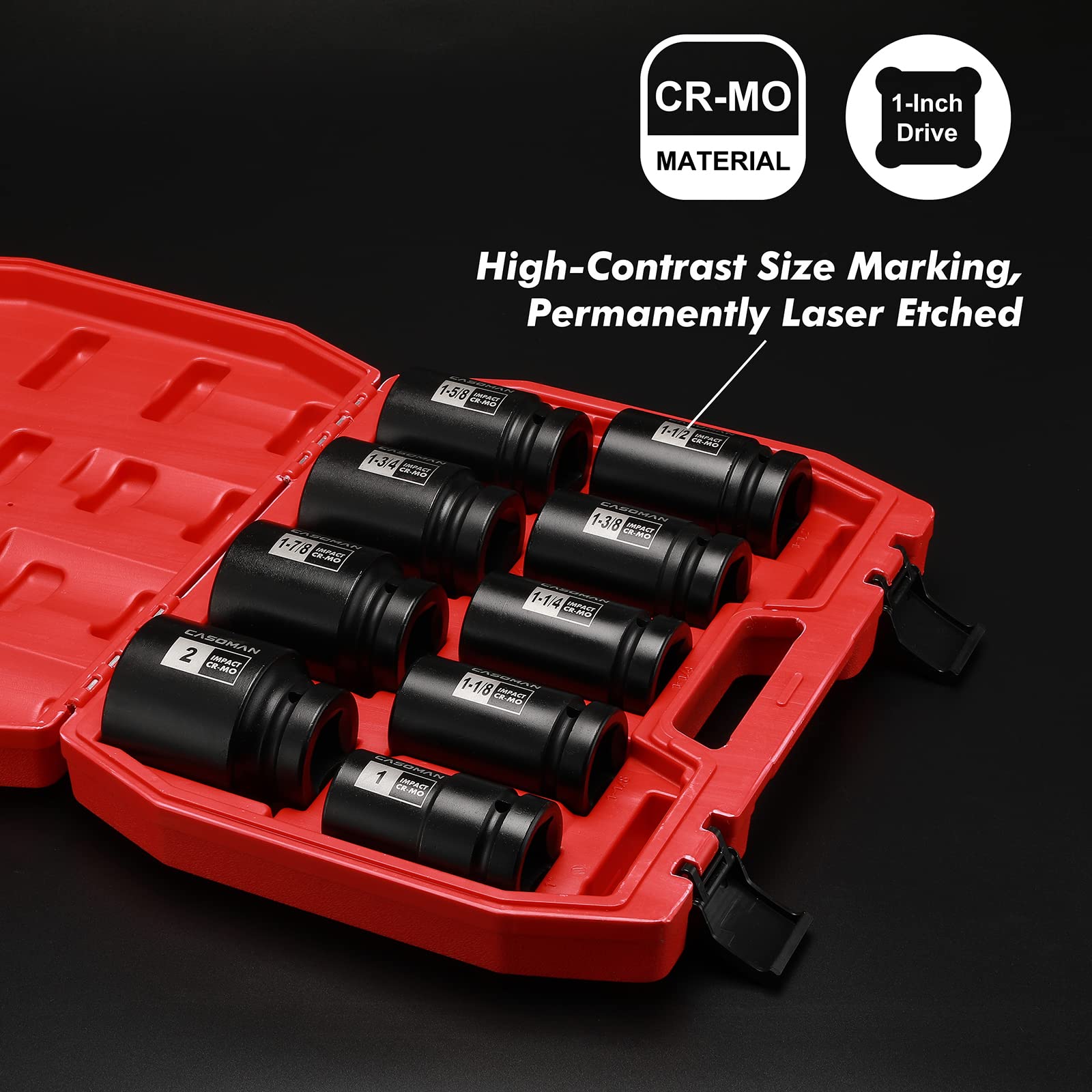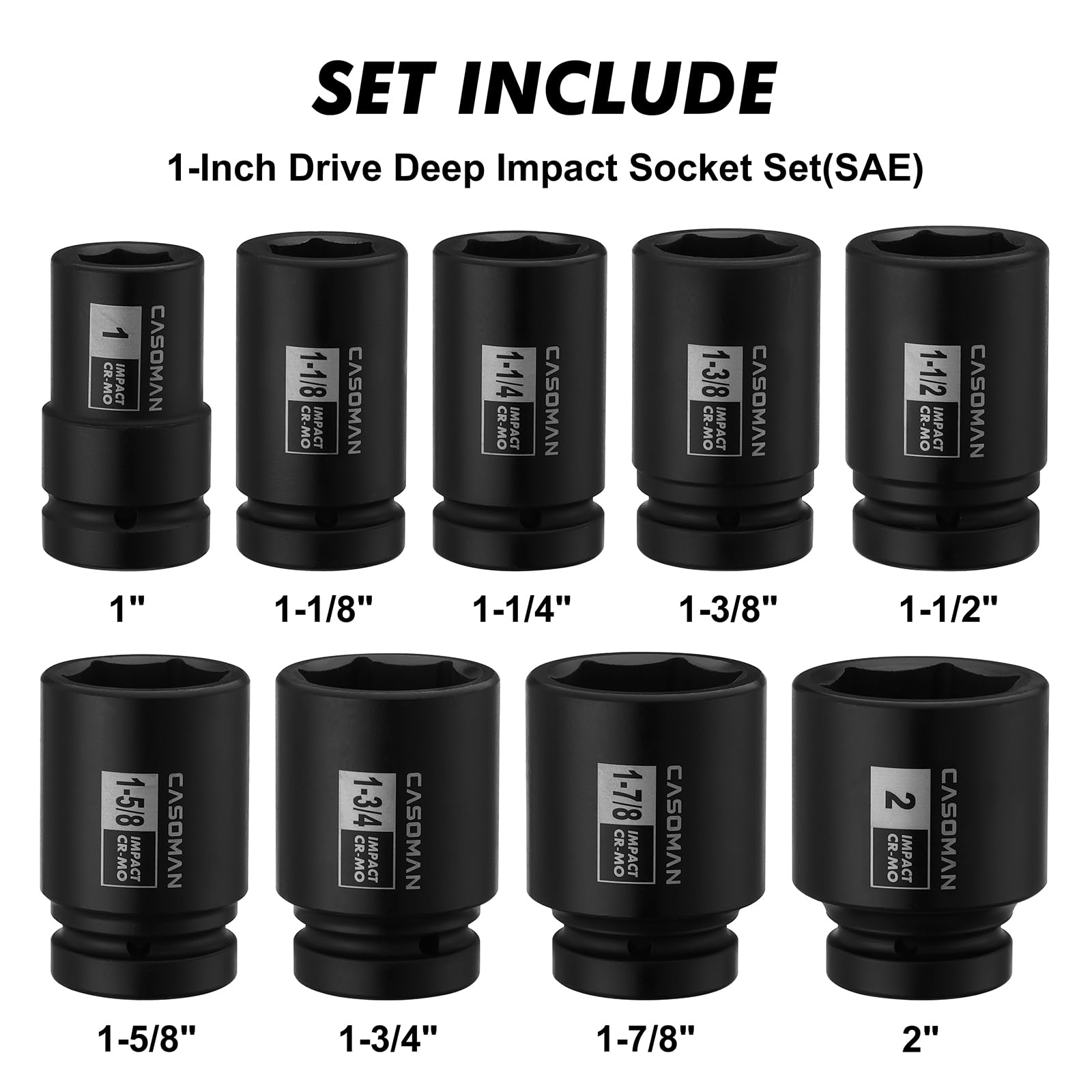 Set include: 9Piece 6 Point 1-Inch Drive Impact Deep Socket Set: 1", 1-1/8", 1-1/4", 1-3/8", 1-1/2", 1-5/8", 1-3/4", 1-7/8", 2"