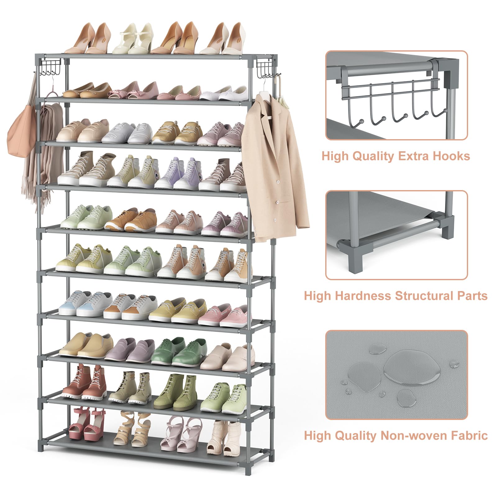 【Large Capacity 10 Tier Wide Shoe Rack】The 10 tier shoe organizer can store up to 50 pairs of adult shoes, and you can remove one layer to fit long boots. This shoe organizer is not only suitable for shoes, but also for bags, toys, towels, sundries, books, plants and small accessories. Shoe storage with 10 hooks, you can hang keys, umbrellas, bags, etc., very practical design.