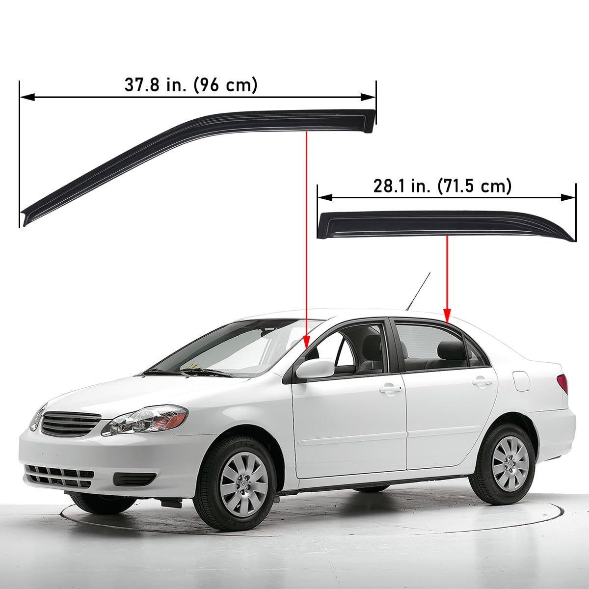 Includes: 2 Pieces of Front Window Deflectors 2 Pieces of Rear Window Deflectors Installation Instructions Mounting Accessories Vehicles Fitments: Fits 2003-2008 Toyota Corolla The window visors are designed for the car owners who love the naturally fresh air with A/C off and windows cracked open in the sunny days. They also help those cars with inefficient A/C to keep fresh air circulation, free of stale air and windshield/window fogging in the raining or any weather condition. This side window deflectors help to reduce the temperature of the car’s cab, when parked in the sunshine with windows partly open. Rain guards are not bodyguard, but they block UV ray, wind, moisture, insects and other debris from entering the car cab, to protect driver and passengers. They help to reduce sun exposure and glare while driving. As a world-wide popular stuff, the side window deflectors have become the most favorite car accessory for the many car owners. We are proud to be a professional manufacturer as we carry a wide variety of window visors that are made with global high-impact materials, precise measurements for an accurate fit, looks and functionality all-in-one. Our complete product range contain In-Channel, Tape-on, Dark Smoke and Matte Black for buyer’s options. Don’t hesitate to inform us your vehicle’s year, make, model or engine number, and our experts can find a set of rain guards that will fit the windows of your beloved cars. Let our set of window deflectors make your trips and ride more enjoyable.
