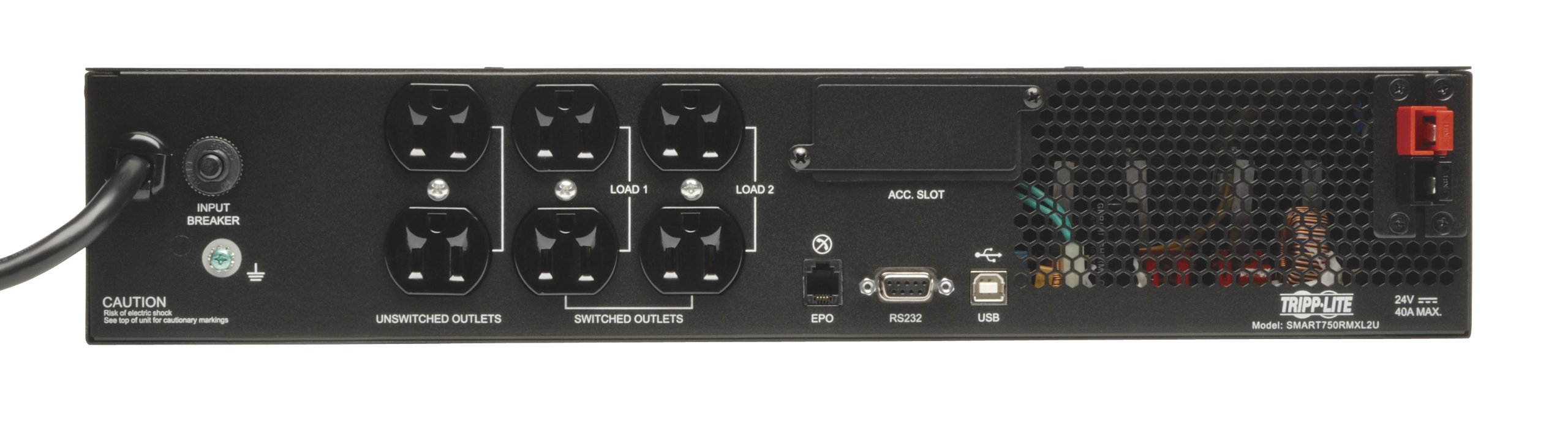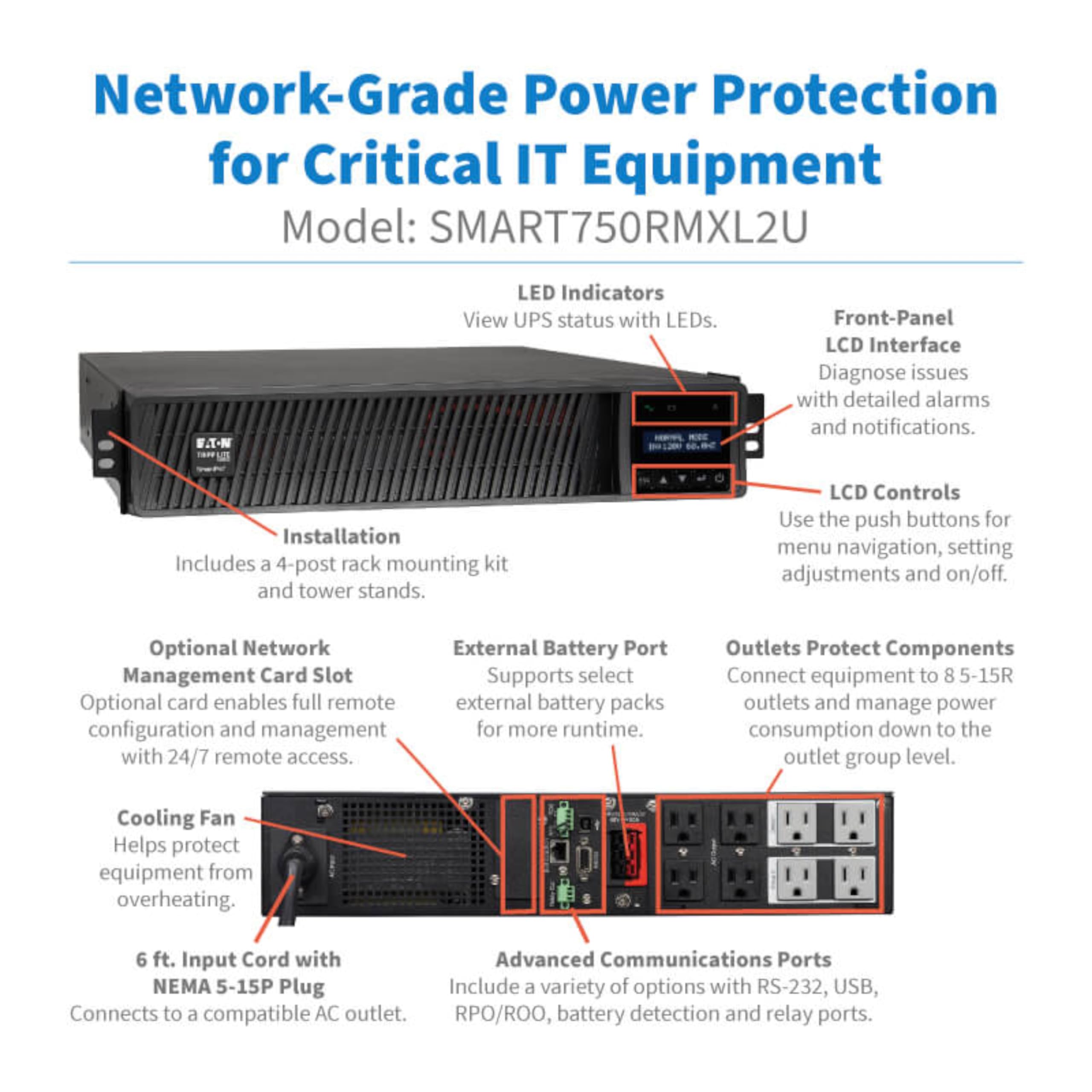 Tripp Lite SmartPro Line Interactive UPS with enhanced LCD interface offers network-grade power protection for critical server, network and telecommunications equipment. Line Interactive Uninterruptible Power Supply (UPS) with built-in Auto-Voltage Regulation (AVR) actively corrects brownouts and overvoltages back to usable levels while maintaining a full battery charge in case of power failure. Interactive LCD interface reports UPS operating mode, detailed UPS and site-power data, plus enables a variety of UPS setup and configuration options. Super-fast switchover from line to battery power occurs within milliseconds to maintain operation of connected equipment without interruption or reboot. 95% line-mode efficiency offers reduced heat emissions and operating costs. Network management interfaces support communications via USB, RS-232 and slot for optional Network Management Card options. HID-compliant USB interface enables integration with built-in power management and auto shutdown features of Windows and Mac OS X. Network communications ports enable detailed monitoring of equipment load levels, self-test data and utility power conditions. PowerAlert UPS monitoring software is available via free download. Switched output load banks enable scheduled and real-time remote reboot and load shedding of select outlets. Emergency Power Off (EPO) interface. LCD display panel easily rotates for viewing in rackmount or tower configurations. Audible alarm with push-button momentary alarm-cancel and silent-mode configuration options. Programmable self-test. Field-replaceable, hot-swappable battery modules.
