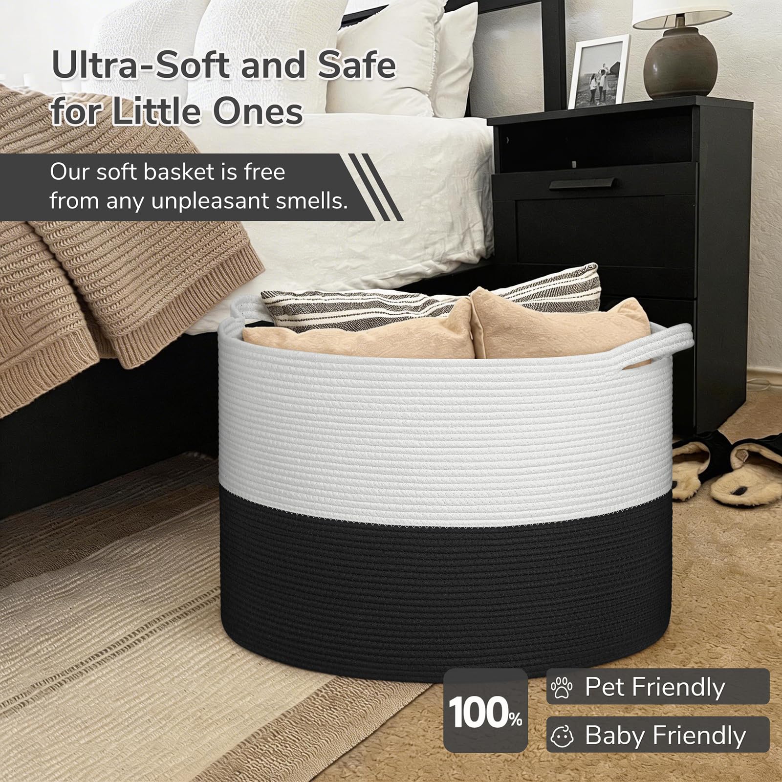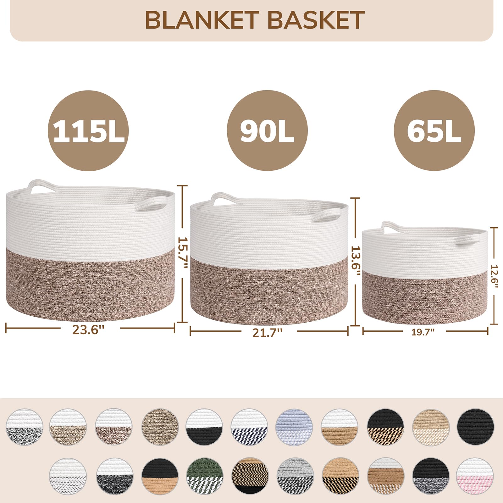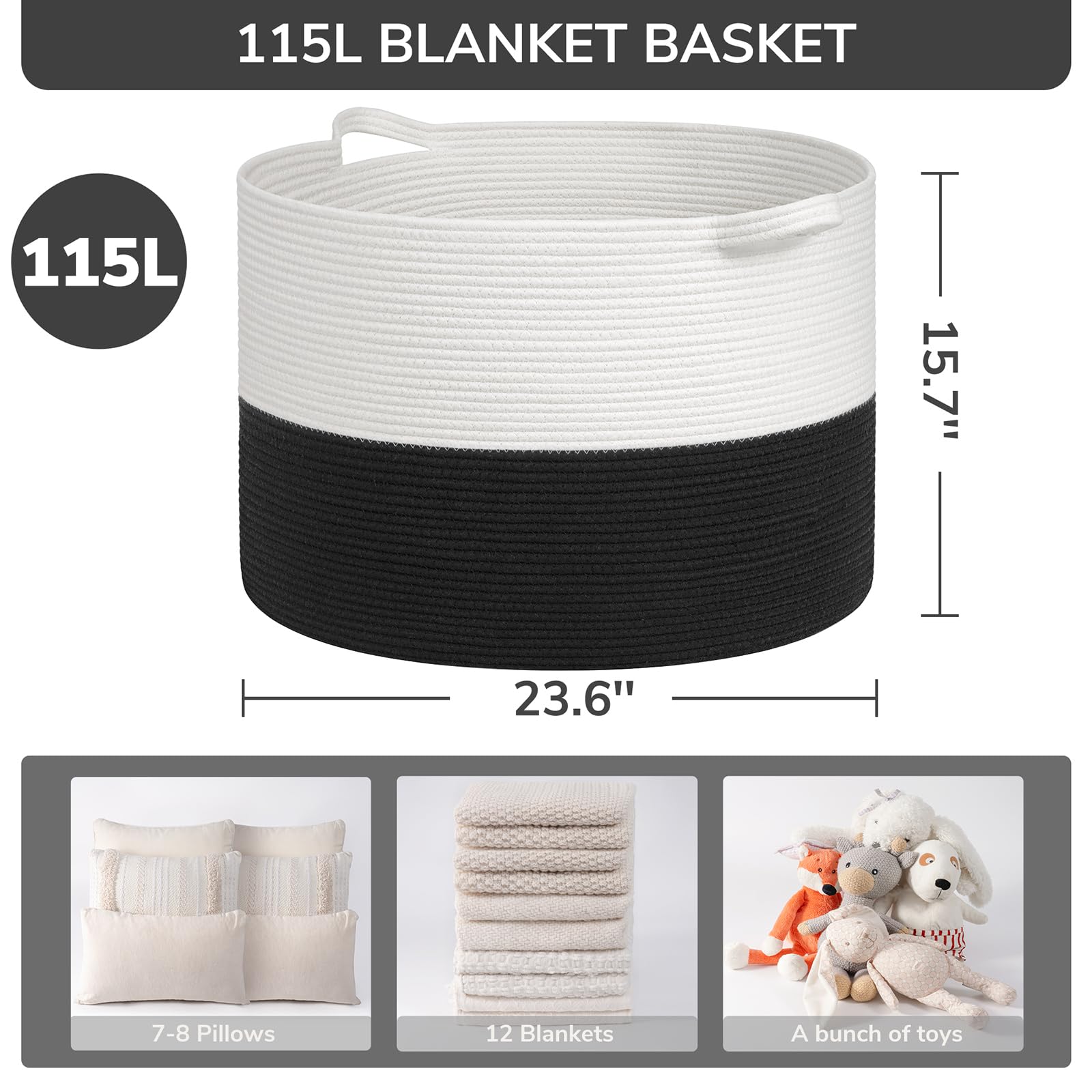 Spacious Jumbo Design. This 115L black and white decor(23.6"D x 15.7"H) provides 30% more space than our 90L model, perfect for larger families or more extensive organizing needs. It easily holds extra blankets, clothes, and toys, keeping your home tidy and stylish.