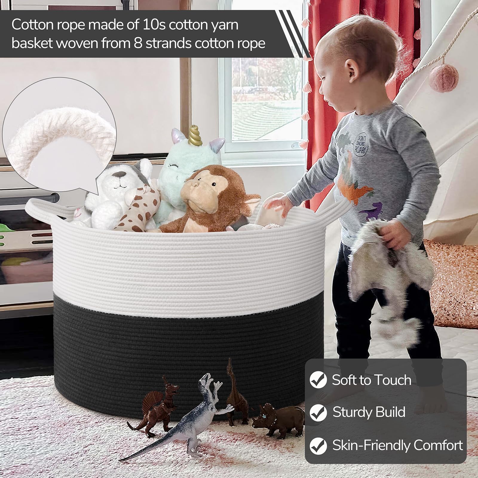 High-Quality Craftsmanship. Made from soft, durable cotton rope, this baby toy basket is slow-woven for even texture and reinforced to prevent sagging, ensuring long-lasting use.