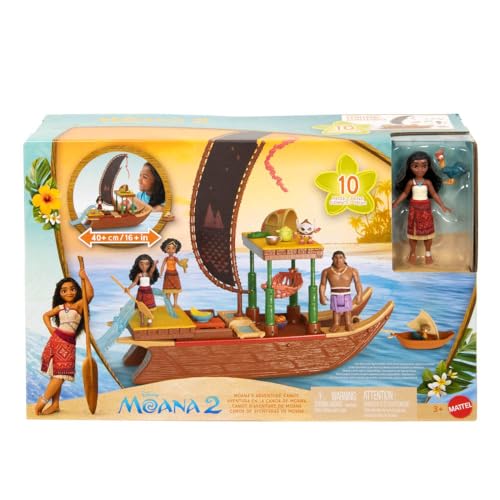 Moana's Adventure Canoe playset, inspired by Disney's Moana 2, the theatrical sequel to the original film, is ready to explore the sea and set sail beyond Motunui! With six transforming play areas – a foldable water slide, hidden kitchen and hammock, platform, animal hut and animal boat – the opportunities for storytelling play are endless. Moana small doll and her friend, Heihei the chicken, come together on the almost 2-foot-long floating canoe for fun on land, sea or bath tub! Long travels work up an appetite, so coconuts, oranges and bananas are included with other dining accessories for a tasty snack. Dolls cannot stand alone. Colors and decorations may vary.