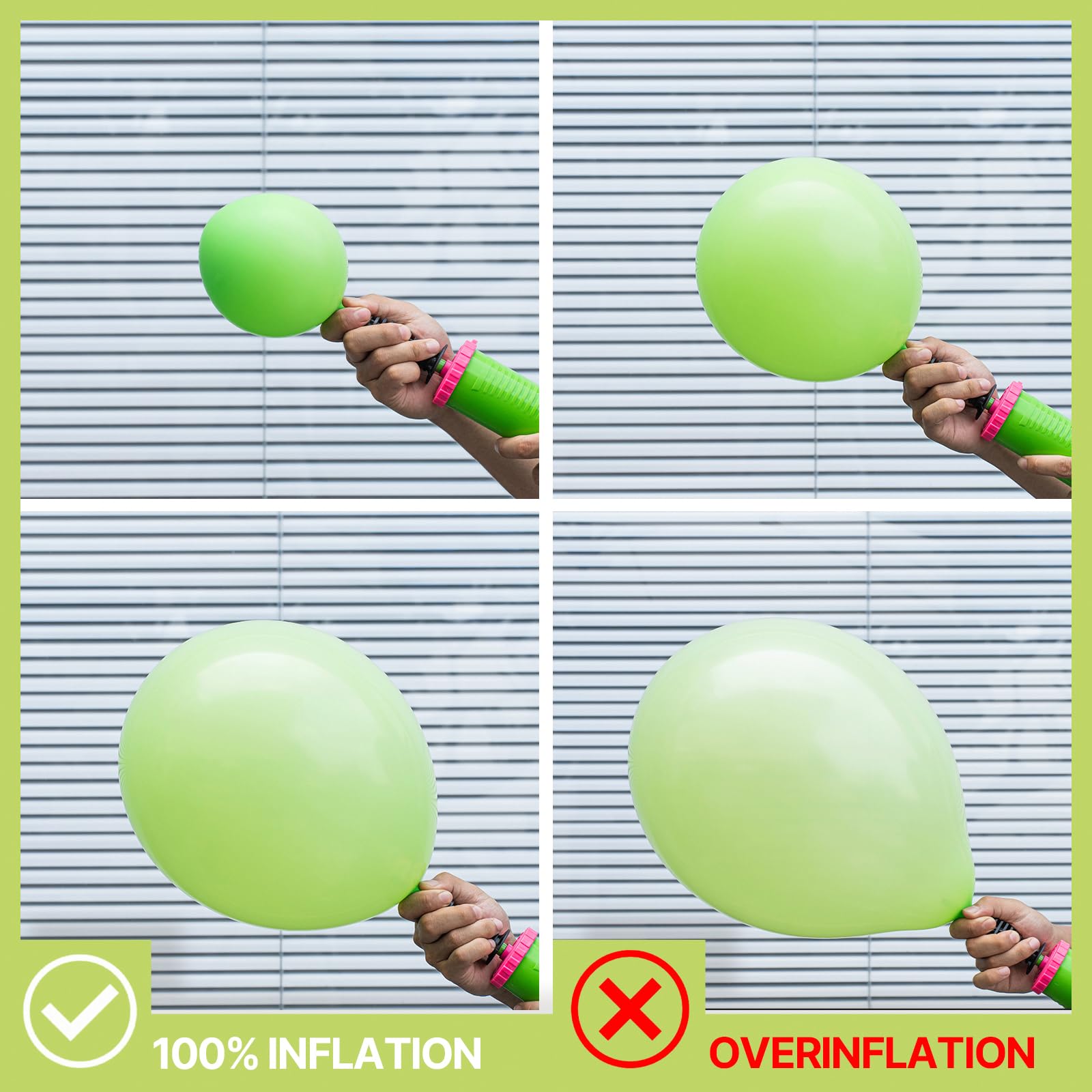 ATTENTION & WARNING: Please DO NOT overfill the balloons and also avoid sunburn, overheat, pointed object and excessive friction. Control the amount of air inflated into each balloon to achieve your ideal balloon size