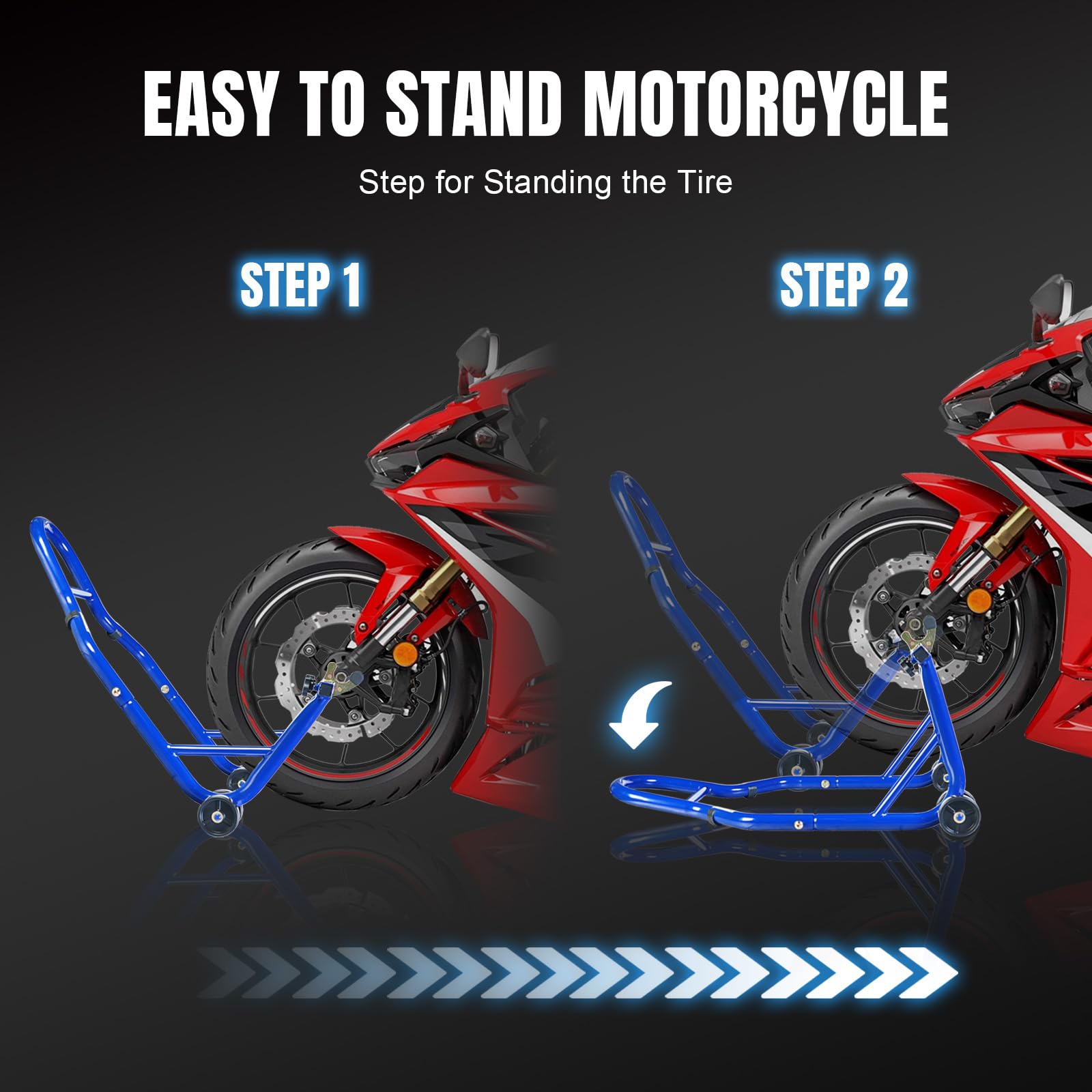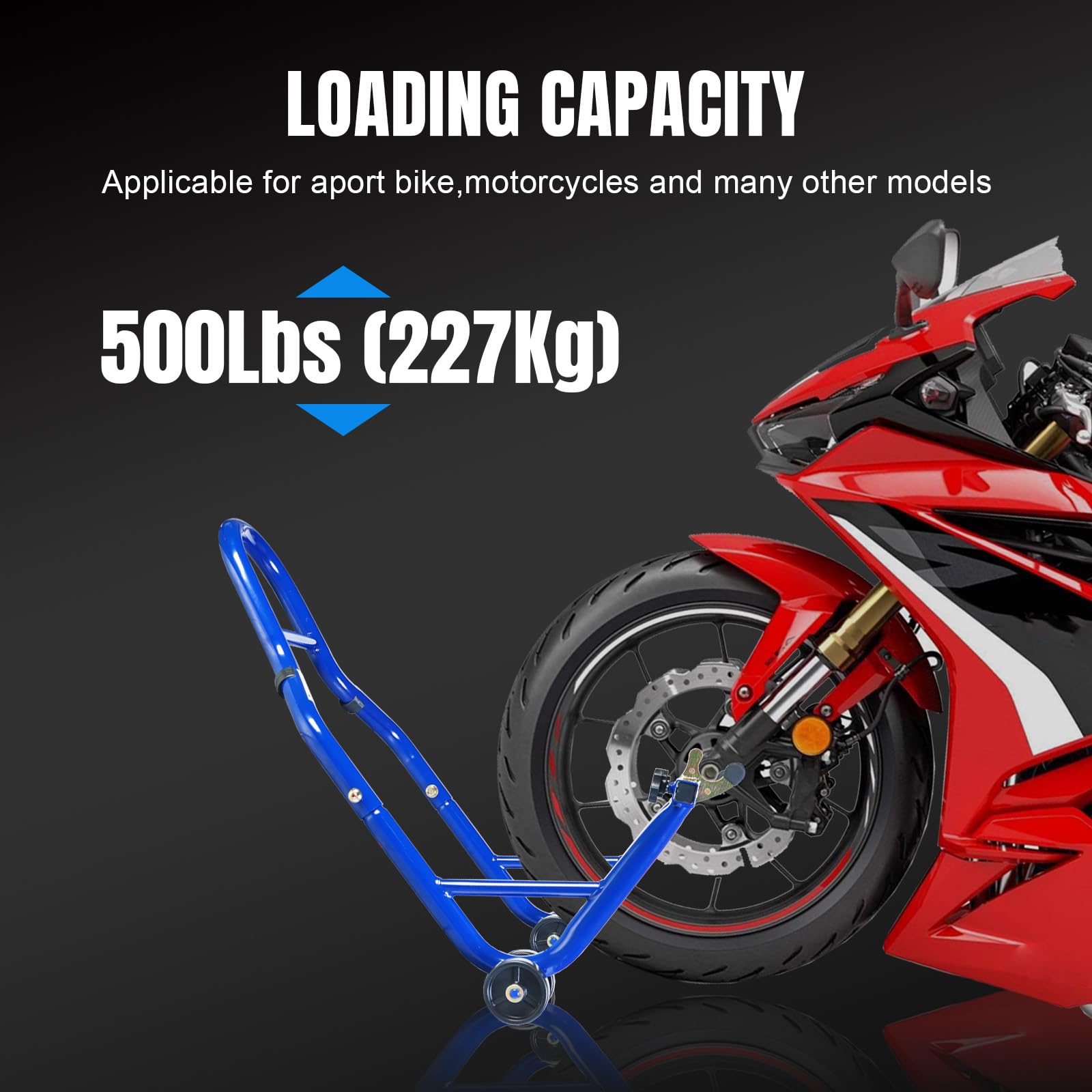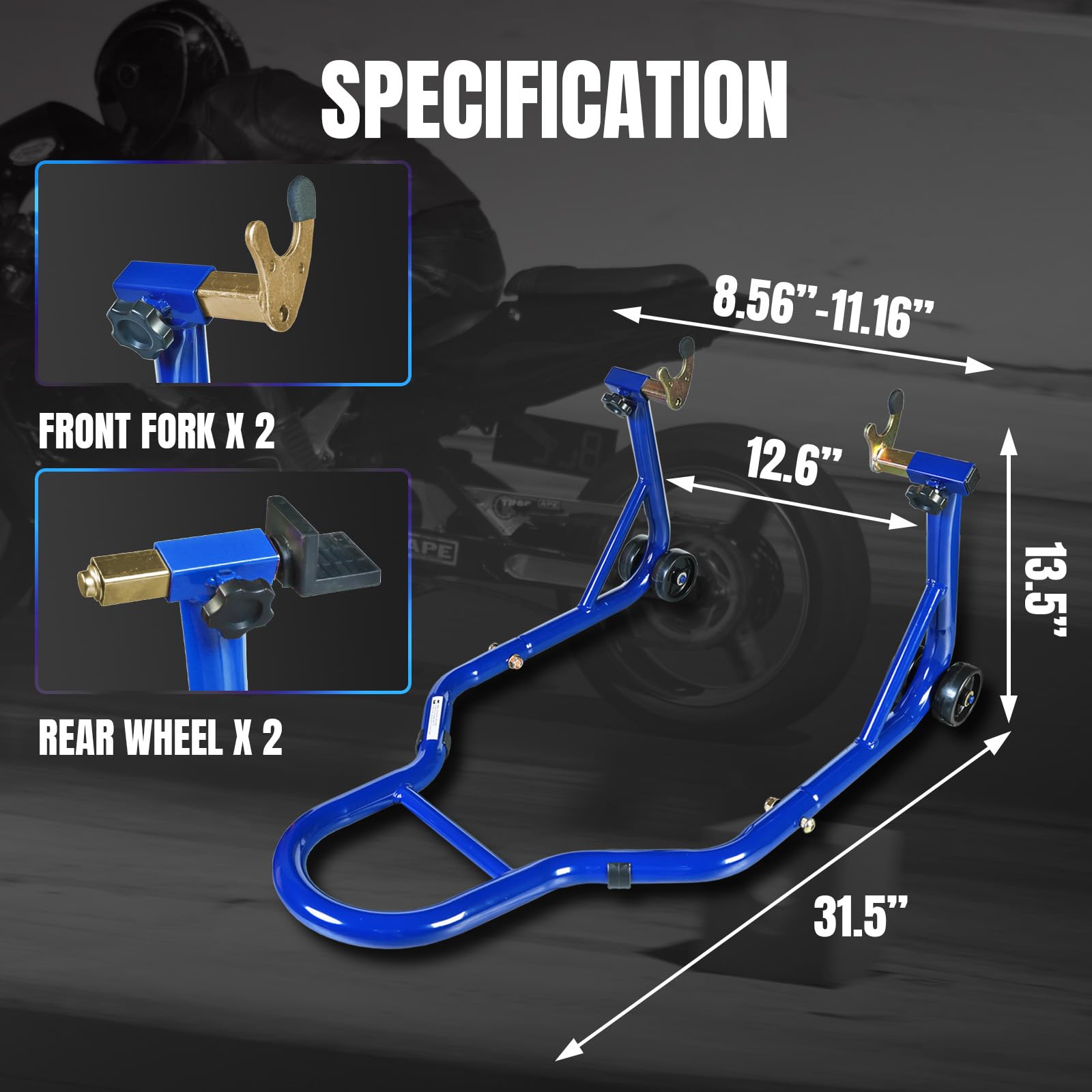 Adjustable Width Design: The front sport bike lift stand fits wheel forks 8.56" to 11.61" wide.The rear lift stand fits rear swing arm spools 9.06"to 13.78" wide and contains rubber padding.Suitable for most bikes and motorcycles due to adjustable design,such as Yamaha,Honda,BMW,Kawasaki,Suzuki etc.