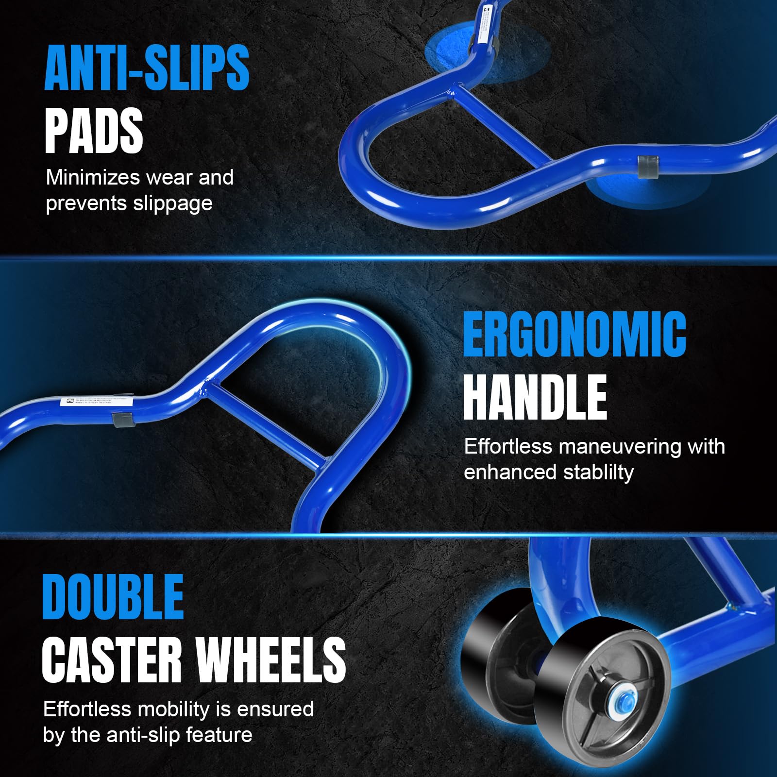 Safey Support To Use: Motorcycle wheel lift stands with 500 Lbs capacity have enough levearge to lift motorcycles off ground,reaching 12.6" height and supporting it in a safe way.Equipped four high quality PP caster wheels add much stability of support,providing a smooth glide and convenient use