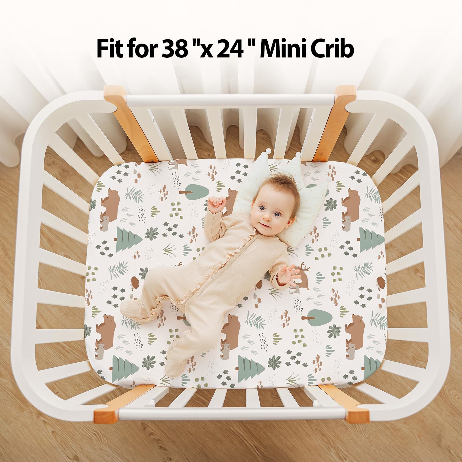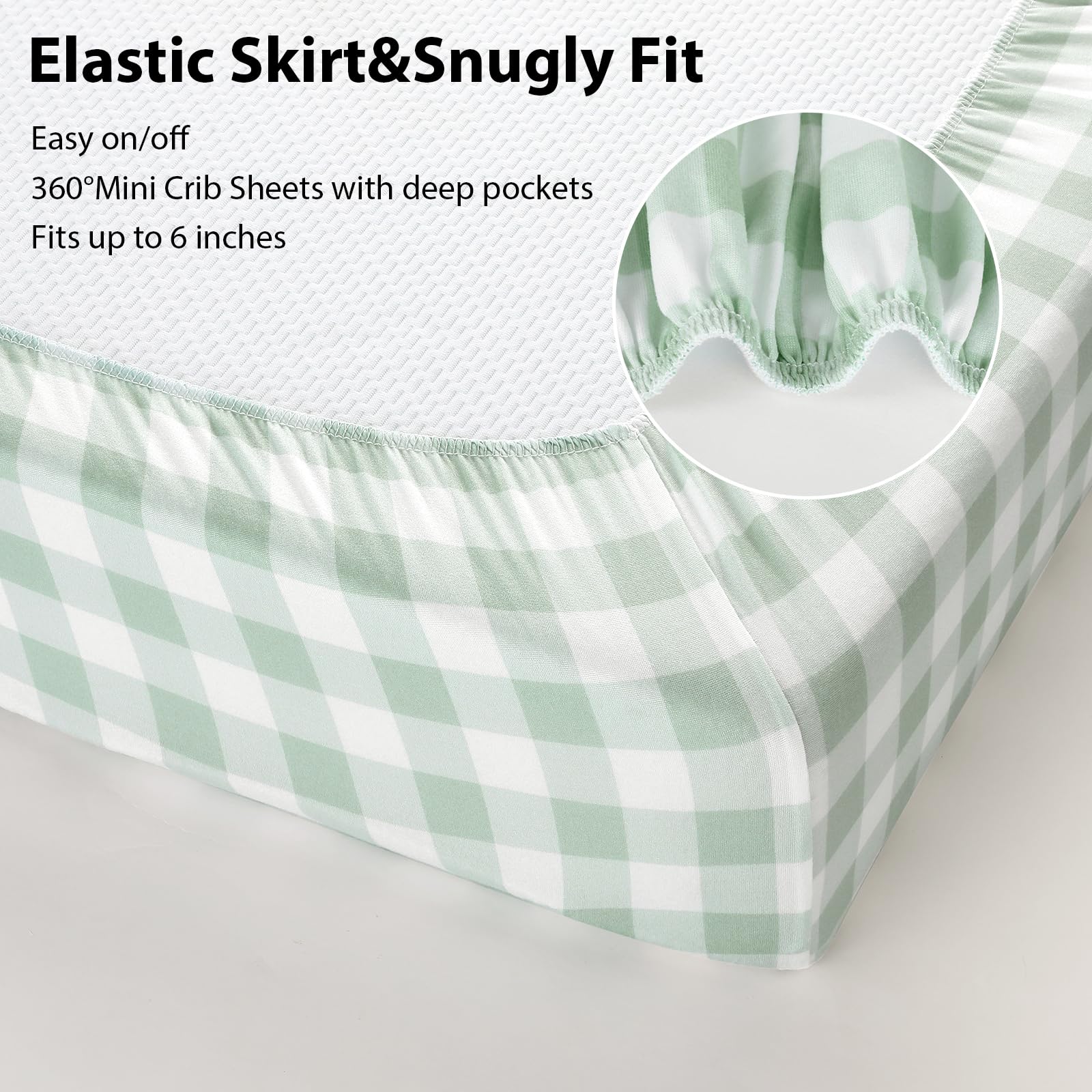 Snug Fit: Measuring 38” x 26”, our 3-pack mini crib sheets fit most baby portable plapens and pack n play mattresses. With elastic bands around the edges of the playard sheets, an 6-inch deep pocket, and stretchy fabric, they ensure a snug, wrinkle-free fit that stays securely in place.