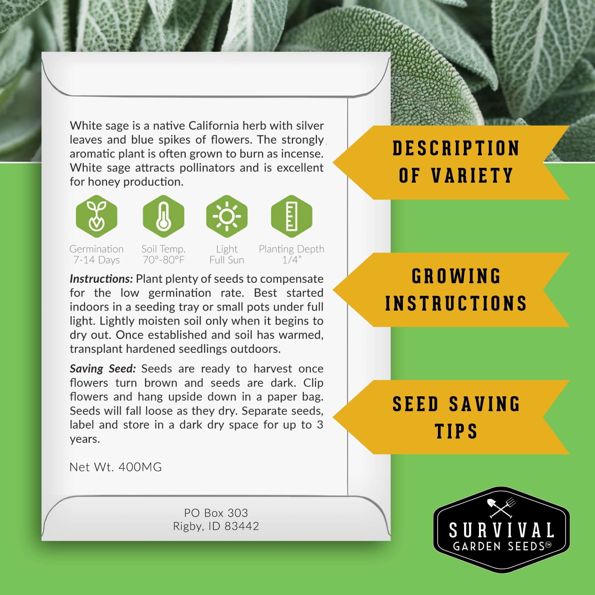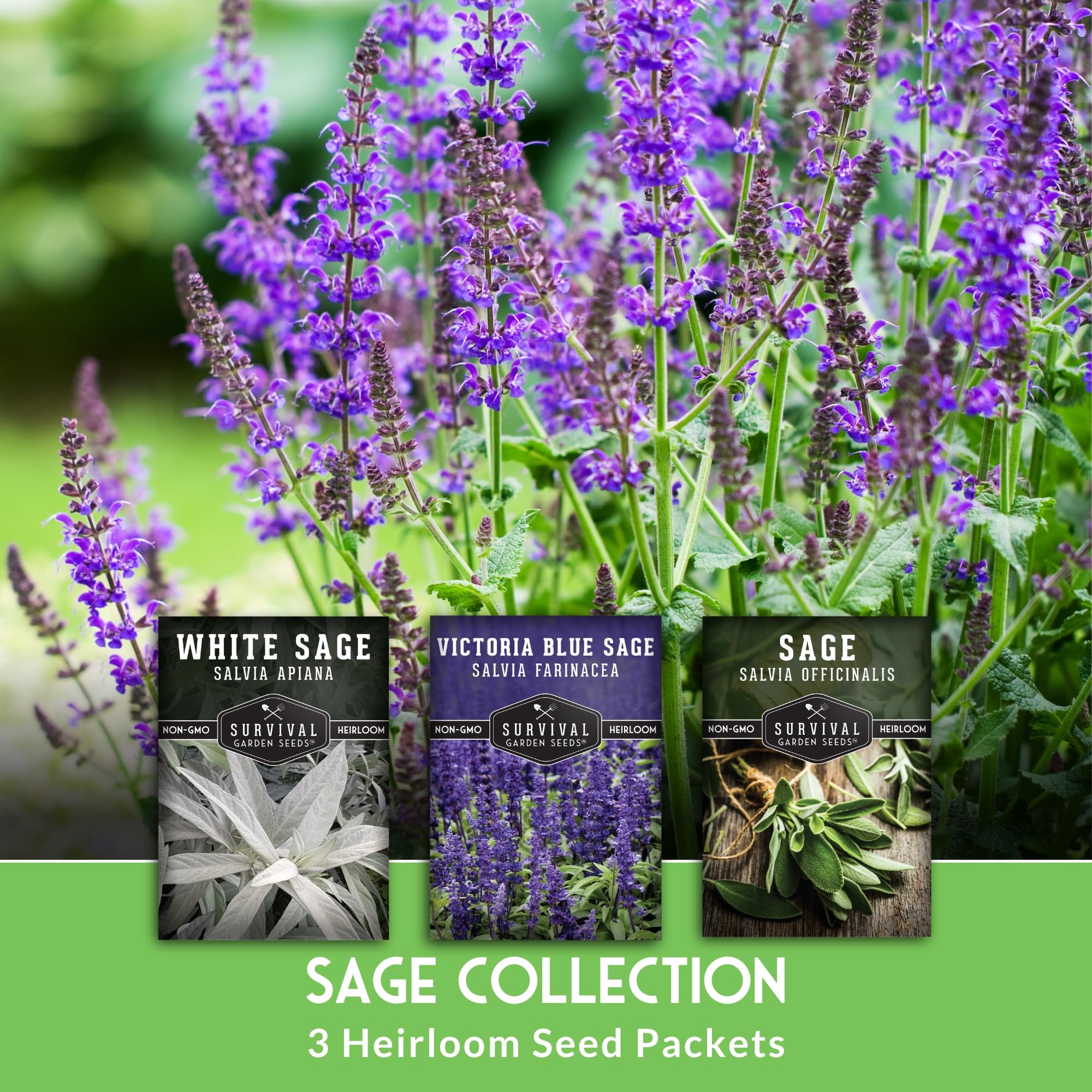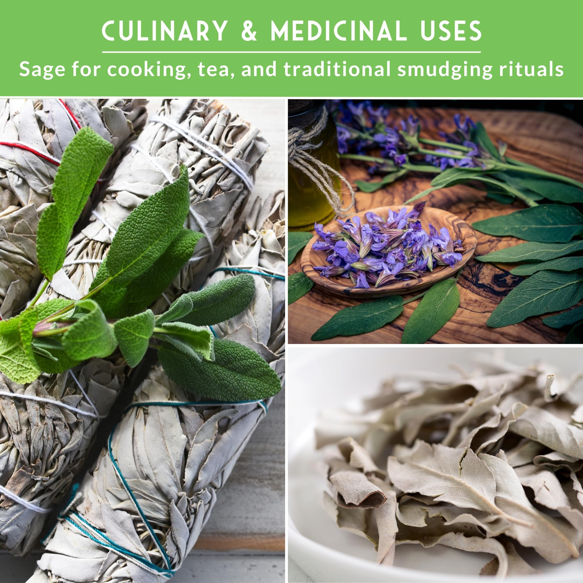 Three Types of Sage Seed - Culinary sage is a treasured herb, used for flavoring sausages, vegetables, and dressing for Thanksgiving. White sage is a unique herb used in smudging for traditional ceremonial uses and can be brewed into a medicinal tea. Victoria Blue is also called mealy cup sage and is a native perennial wildflower.