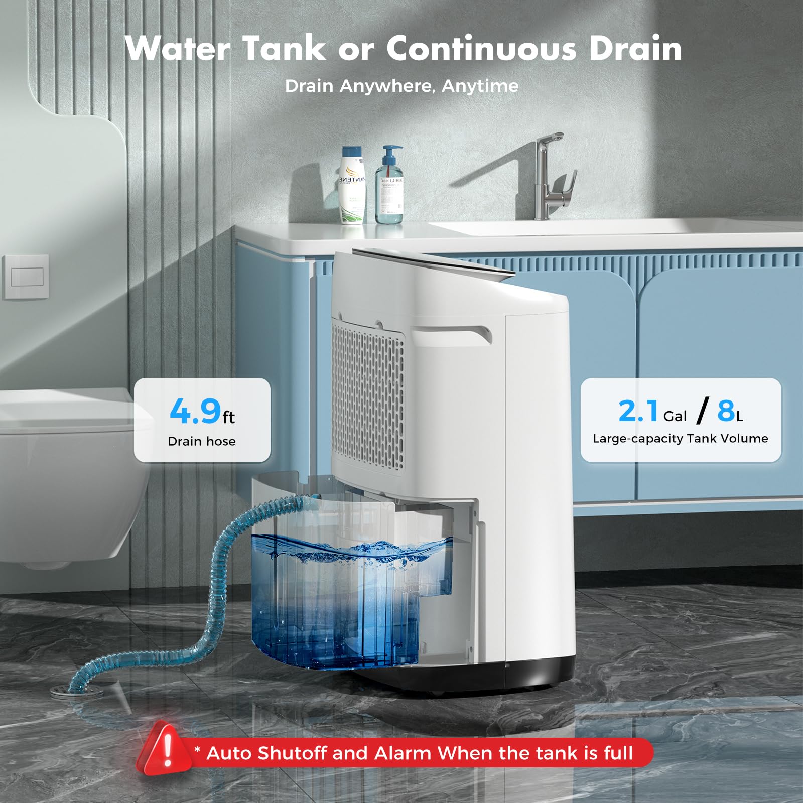 【User-Friendly Design for Effortless Use】Enjoy flexible drainage with an included hose for continuous use, or manual emptying via the 2.15-gallon tank (auto-stop and alarm when full). Pre-installed casters and a hidden handle allow easy portability between floors. The intuitive interface delivers effortless control in any scenario.