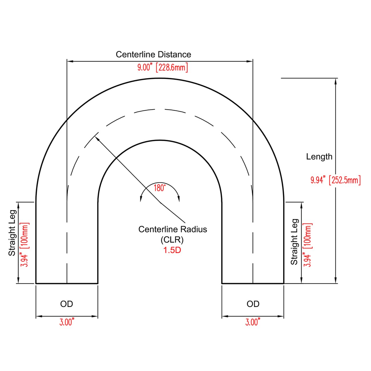180 degree mandrel-bent aluminum intercooler piping. Outside diameter: 3" (76mm), straight leg length: 3.94" (100mm), wall thickness: 0.071" / 1.8mm
