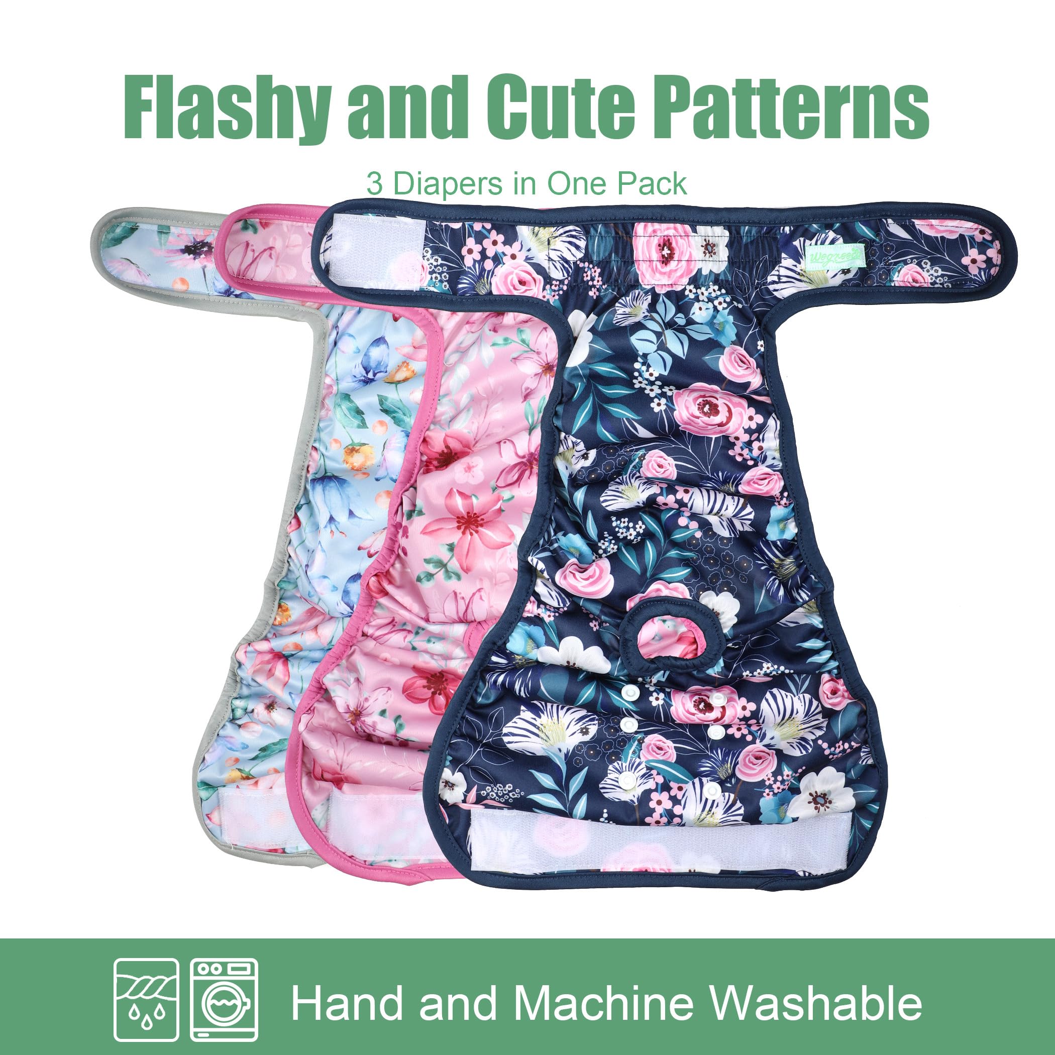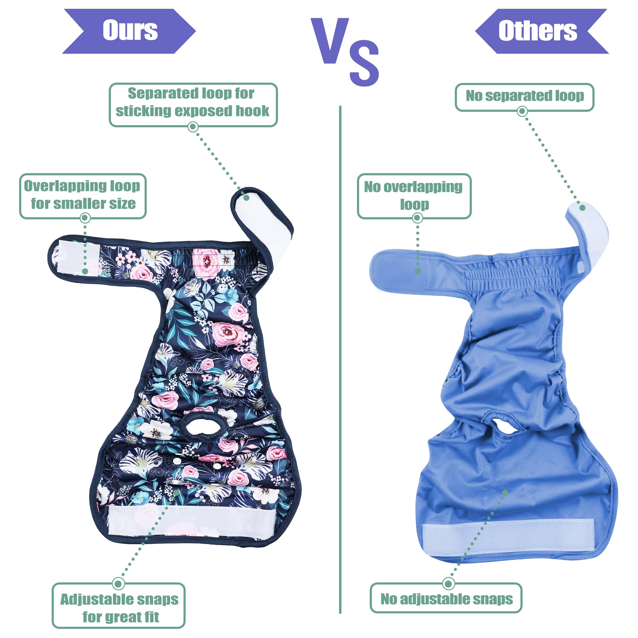 Washable dog diapers- Soft & Comfortable Diapers for Dogs - To increase your dog's comfort and acceptance our diaper wraps have no "crinkly" or uncomfortable texture that causes many dogs to dislike the ordinary disposable diapers. Hook & loop closures are quick and easy to put on and won't stick to your pet's fur.