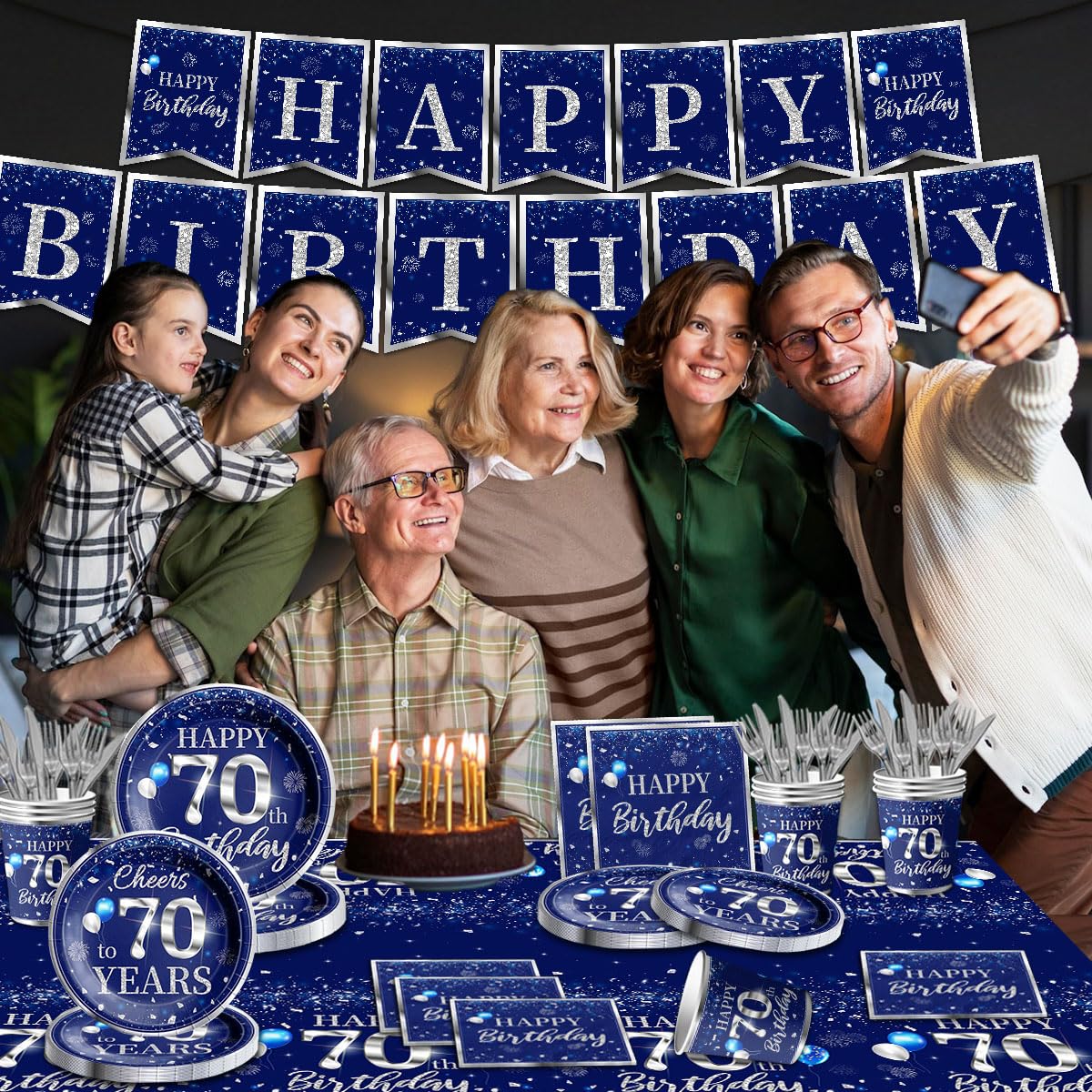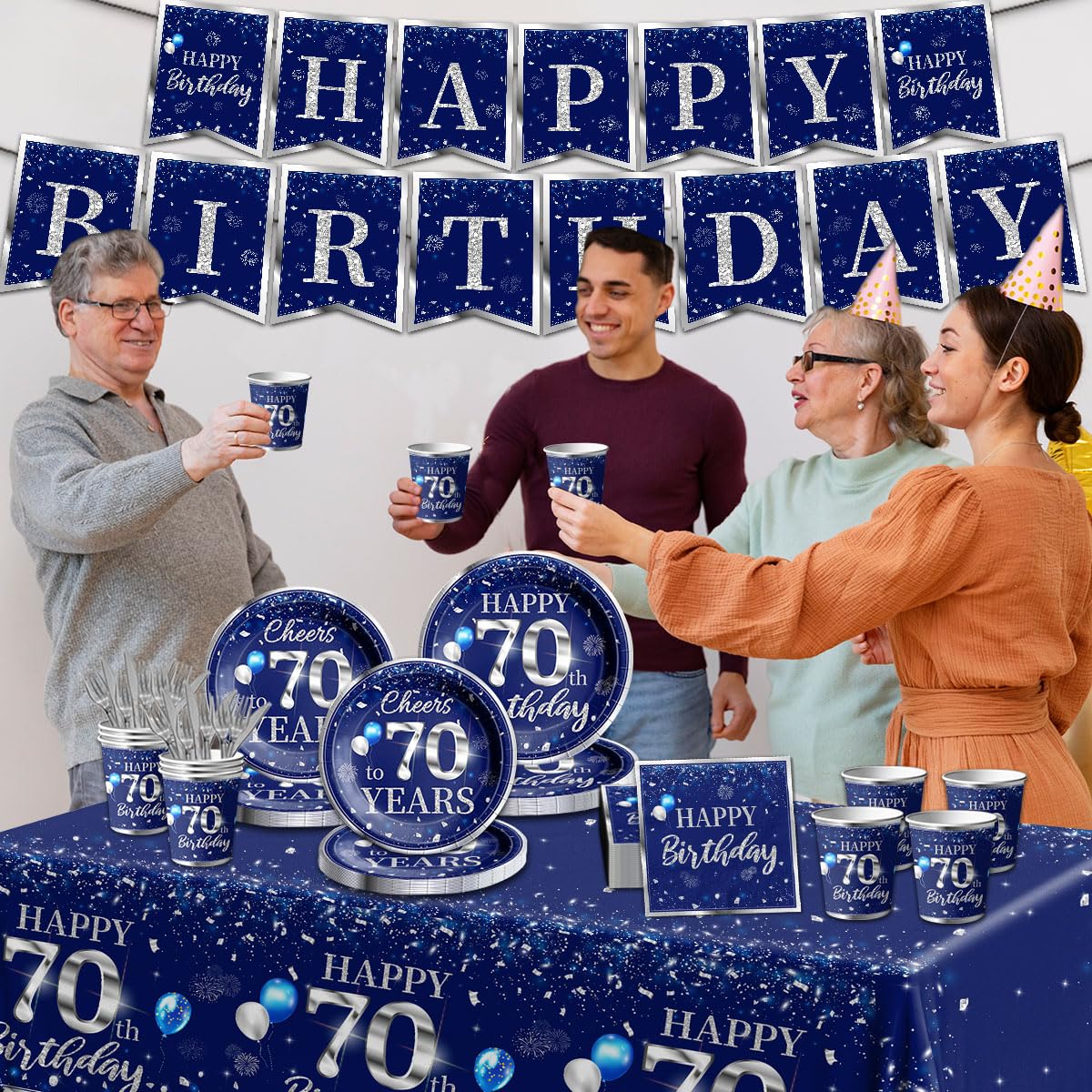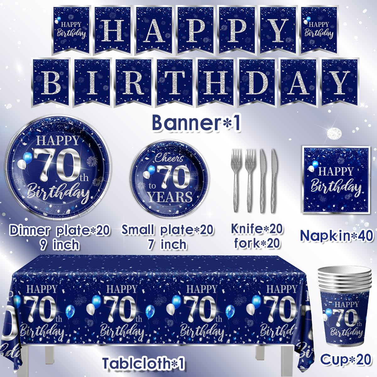 🍰【Package Includes】The party set includes :1pc"Happy birthday"banner,1pc 70th sliver and blue birthday tablecloth, 40pcs disposable paper plates (2 sizes), 20pcs paper cups, 40 napkins, 20 knives, 20 forks, which can meet the needs of 20 guests, and designed especially for men's 70 and fabulous party celebrating.