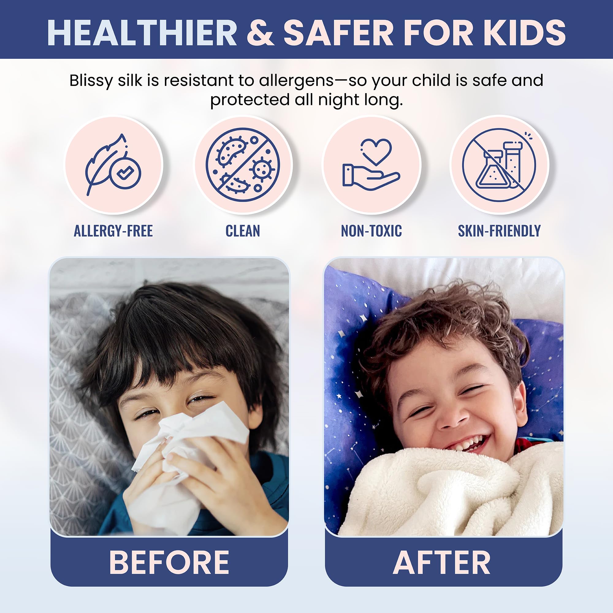 SKIN-FRIENDLY SOLUTION: While cotton is a veritable breeding ground for allergens, silk is totally hypoallergenic -- which means your kids can start waking up with clearer sinuses, dry eyes, and easy breathing. If they have sensitive skin, you’ll also notice less redness, puffiness, and blemishes when sleeping on a hypoallergenic surface like silk.