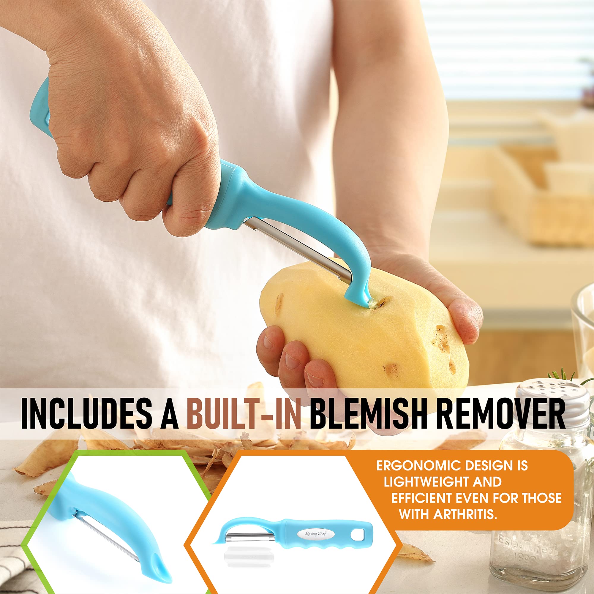 Smooth, Effortless Peeling - Dual Stainless Steel blades stay ultra sharp and swivel to glide along fruits and vegetables easily. Includes a built-in blemish remover.