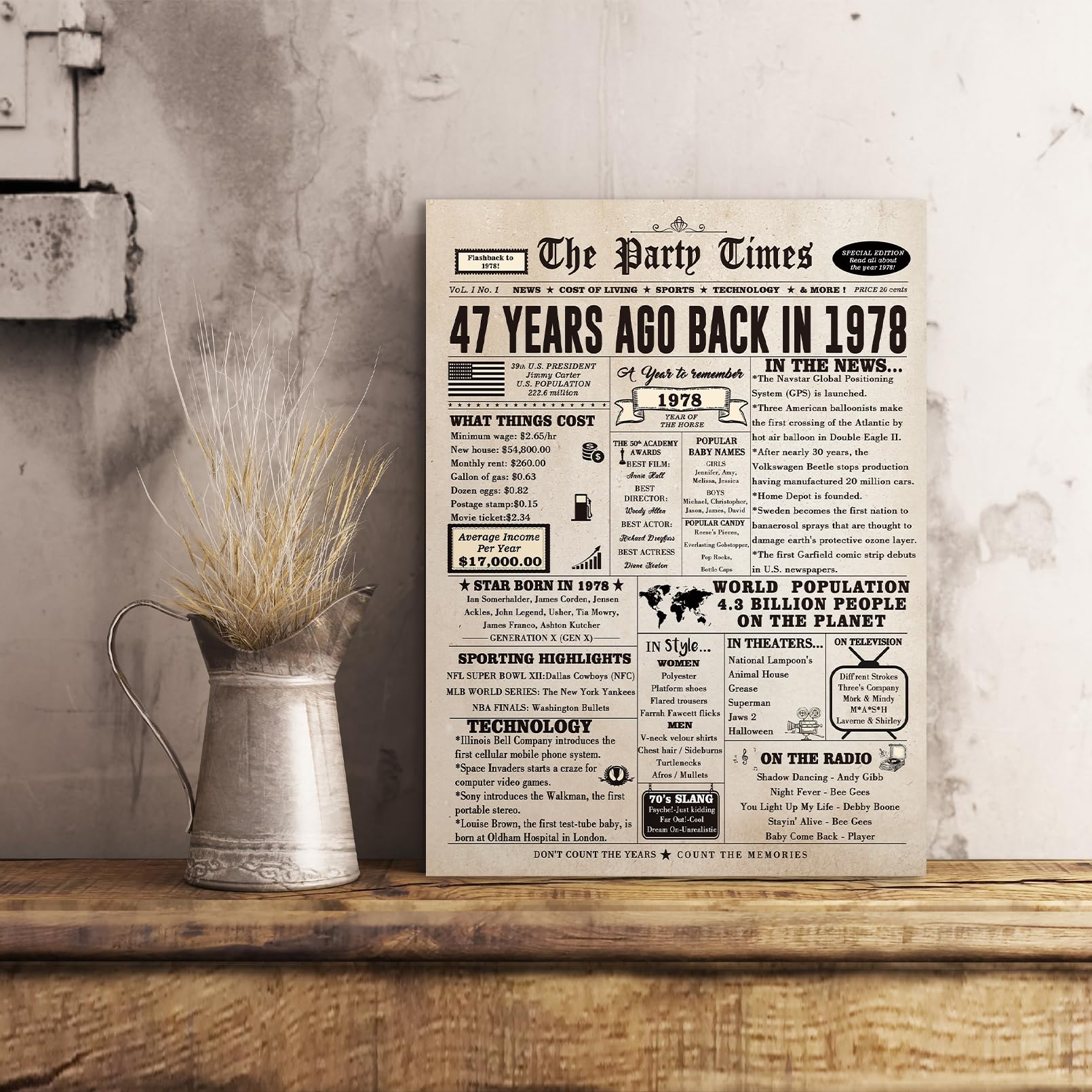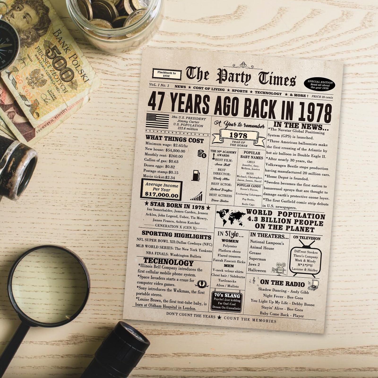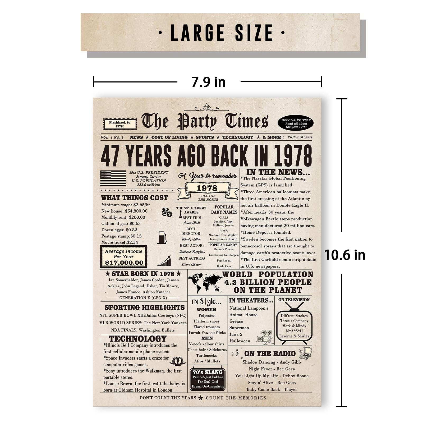 It's more than just a card; it's a cherished keepsake and a testament to the joy of celebrating life's milestones! When it comes to celebrating a remarkable 47 years of life, 47th birthday card is the ultimate tribute to a journey well-lived. Whether you're celebrating your best friend, parents, siblings, or spouse, this card is the perfect gift that encapsulates a lifetime of memories. Perfect option to recognize a milestone birthday. Size is large enough to easily read all the interesting fun facts. Plenty of room inside to personalize, well wishes/messages. Great option when you want a little more than a typical birthday card. Funny card with lots of good facts about the year you choose eg: median house prices, incomes, gasoline, historical events, movies, ect many of the events depicted on the card. The size was great to pass around for all to read, and made it handy to insert my own text.
