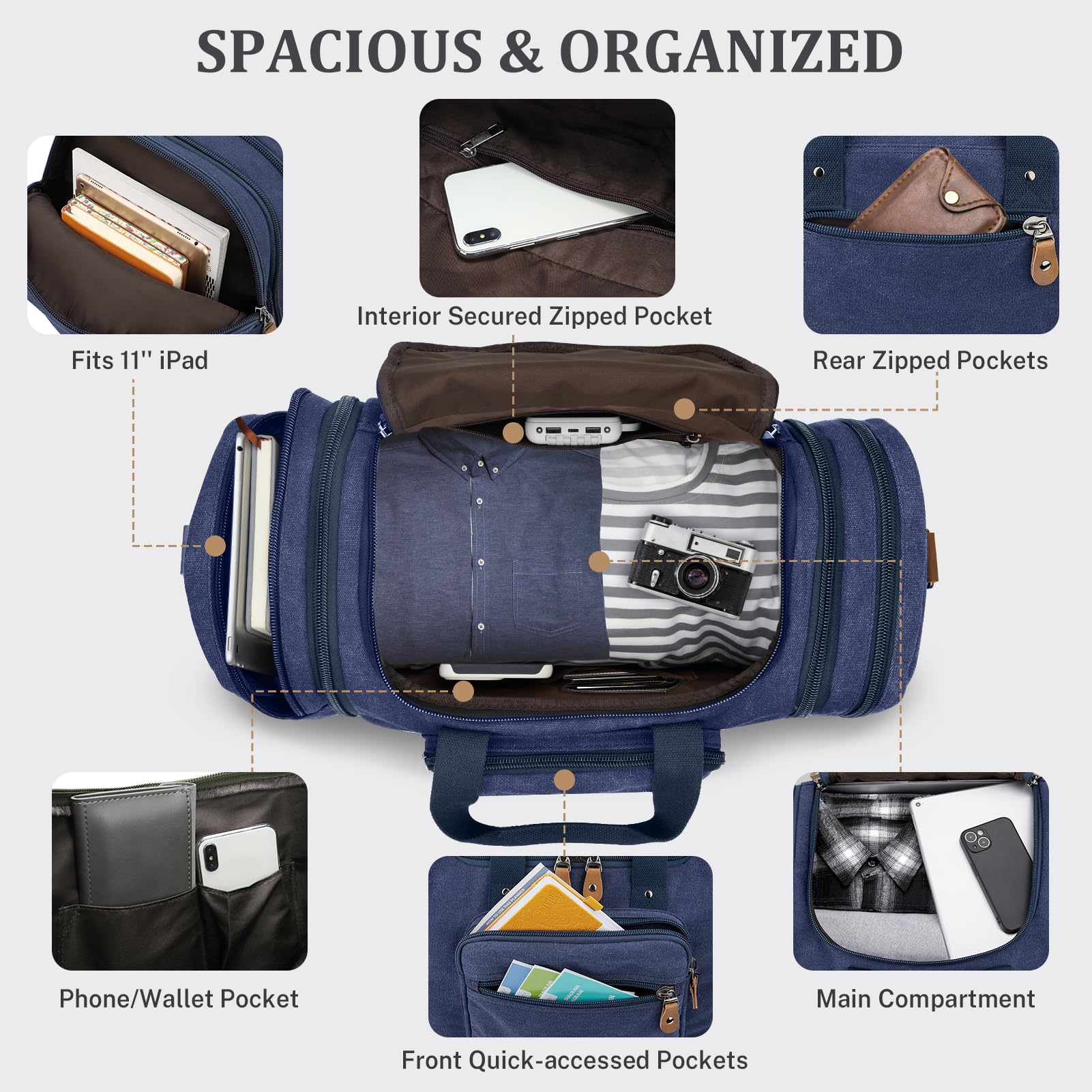 Expandable design: The Canvas Travel Duffel Bag measures (L)20.8 x (W)9.8 x (H)11.8 inches and can be extended to 24.4 inches with two side zippers. Perfect for carrying on flights as carry-on luggage