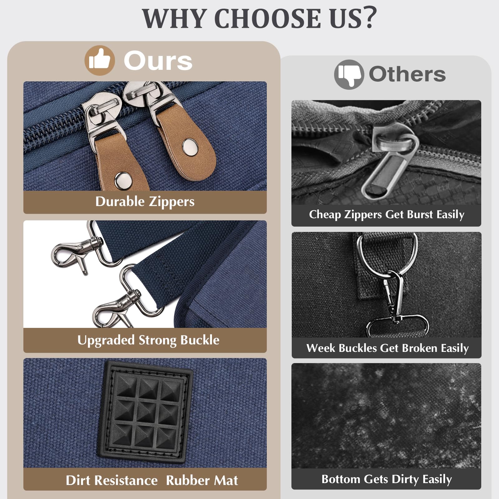 Material: 100% Brand New travel duffel bags made from high-density cotton canvas and classical bronze-tone hardware, with soft canvas lining, large & smooth zippers