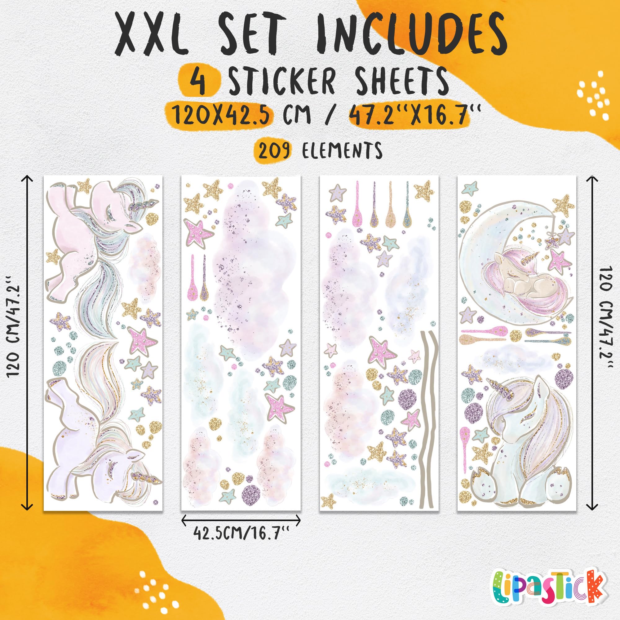 π¦ Package Content: Large decals for baby room come in a pack of 4 sheets. Includes: unicorns, stars, clouds, moon. The sheet size is 47.2" x 16.7". This set of stickers is size XXL and its finished size is 156.2" x 48β. Perfect for covering full wall.