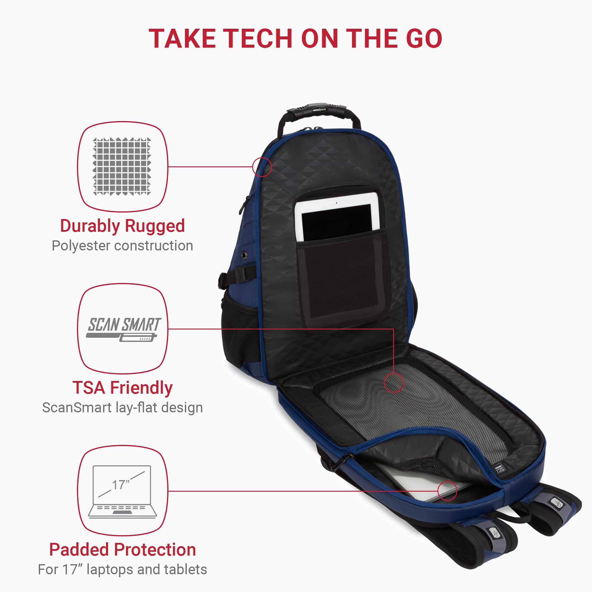 Description The SWISSGEAR 1900 ScanSmart TSA Laptop Backpack is built for professionals, students, and travelers who need durability, smart organization, and travel-ready functionality in a reliable everyday backpack. Constructed from rugged 1200D polyester fabric, this backpack is designed to withstand daily use while maintaining a clean, structured look. The ScanSmart lay-flat compartment allows for faster airport security screening and is designed to fit most 17-inch laptops, along with tablets up to 10 inches. Dedicated protective sections help keep devices secure, while multiple compartments and internal organization provide space for accessories, chargers, and everyday essentials. With overall dimensions of 19 x 14.25 x 9 inches and a 31L capacity, this backpack offers ample storage for work, school, or travel. The expandable storage layout and thoughtfully designed pockets make it easy to stay organized throughout the day. Comfort-focused features include a padded airflow back panel and ergonomic shoulder straps for ventilation and support during extended wear. Additional travel-ready details such as an RFID-blocking pocket and trolley sleeve allow for seamless travel and added security. Backed by a 5-year warranty, the SWISSGEAR 1900 ScanSmart Laptop Backpack delivers dependable performance, durable construction, and versatile functionality for everyday use and travel.