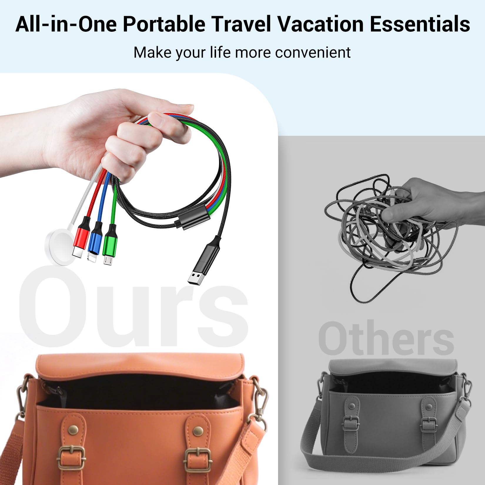 [Travel Vacation Essentials] With its lightweight and portable design, the travel charger for multiple devices is perfect for home, office, travel, car, sports, and more. During weekend getaways, this charging cords allows you to connect multiple devices without the hassle of tangled cables. The multi chargers for all devices takes up minimal space and helps keep your backpack or purse tidy.