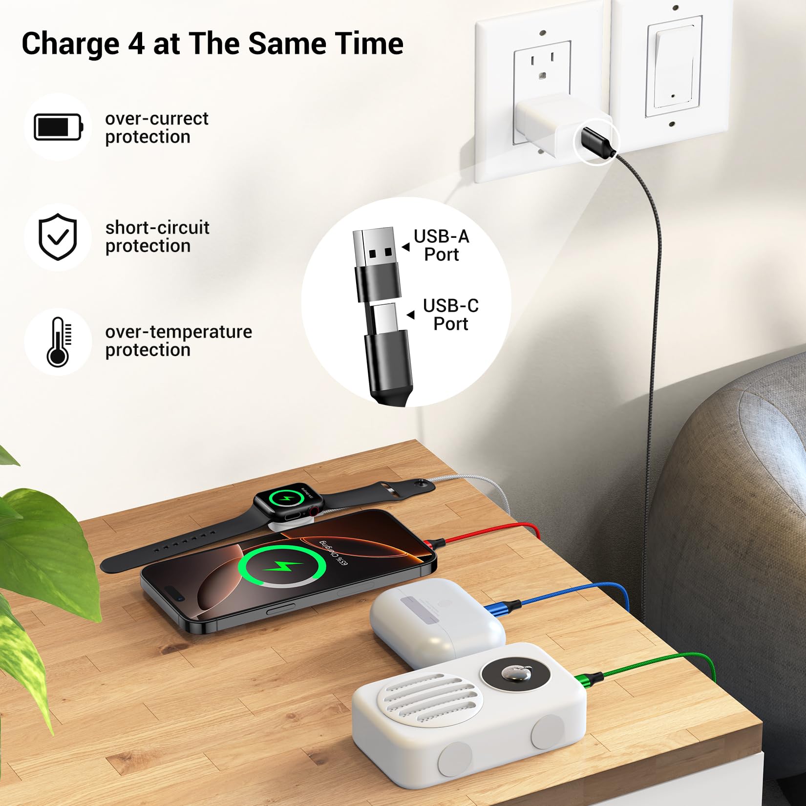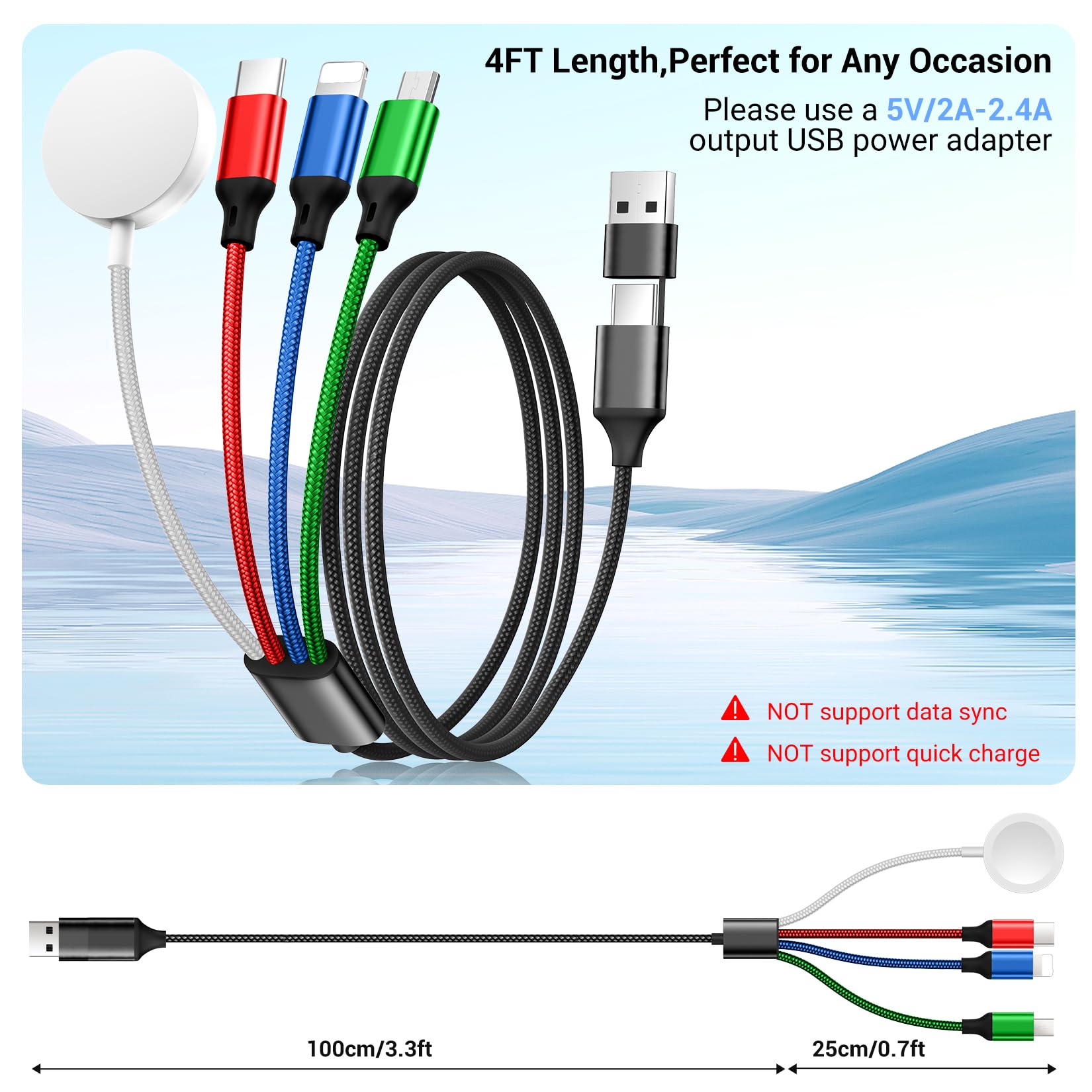 [4 in 2 Charging Cables] One cable = eight charging cables.The state-of-the-art 4-in-2 design features 4 different USB ports,including a watch port,iOS port,Micro USB,and Type-C,which support charging for most devices available on the market.Please note,this chargers for multiple devices is designed for charging only and does not support data syncing.