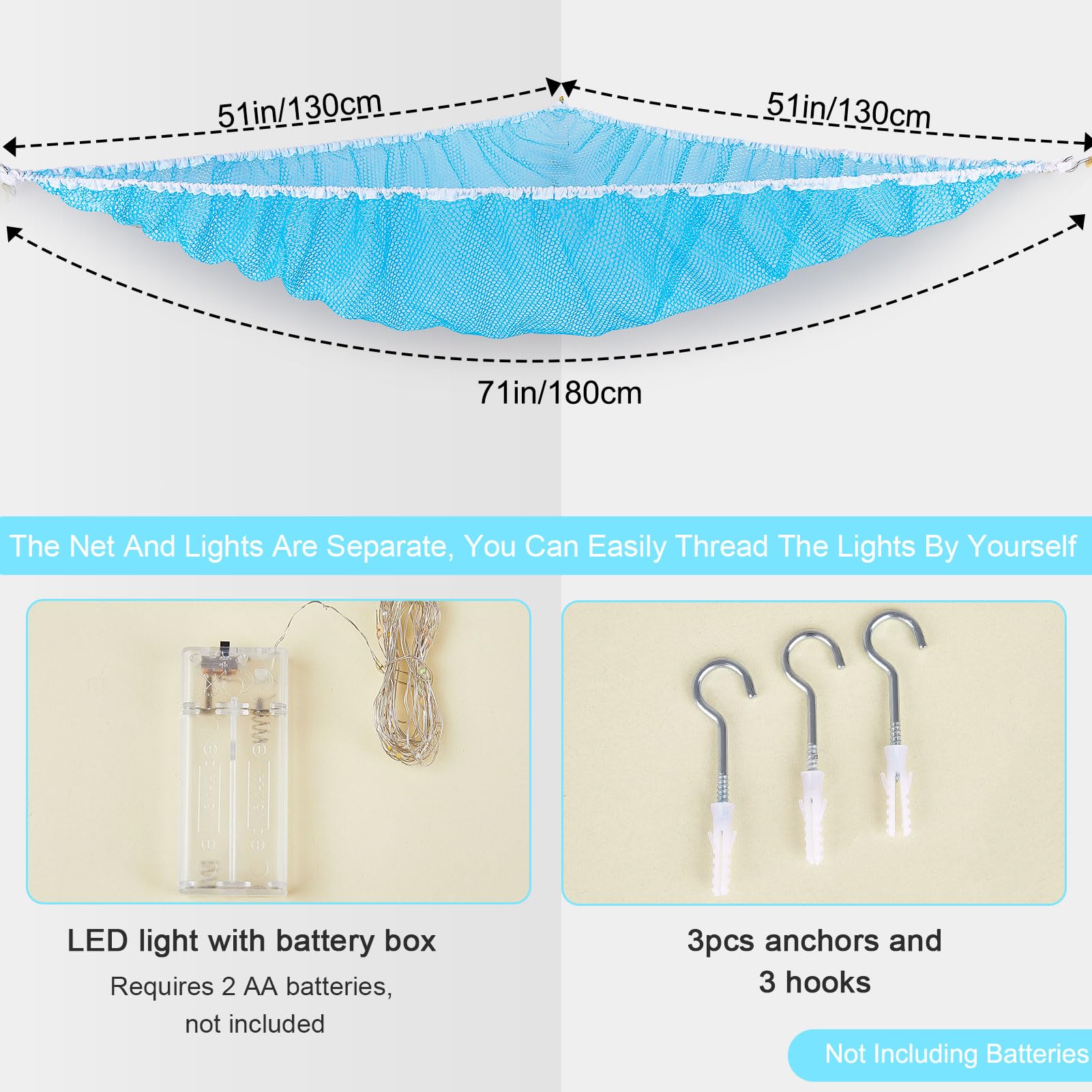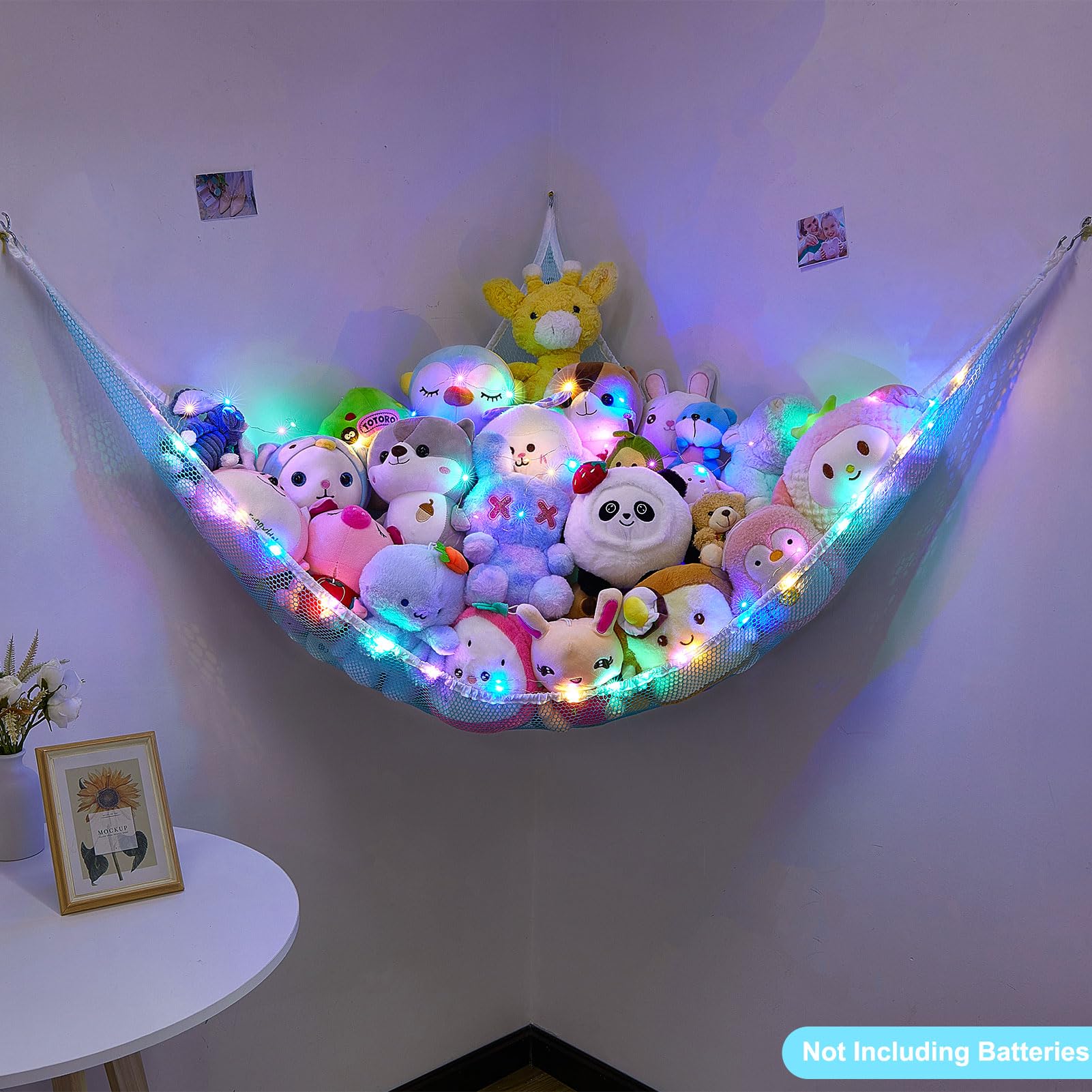 Package Included: 1 pcs stuffed animals hammock, 1 pcs 118 inches LED string light with battery box, Batteries Not Included, 3 pcs wall hooks for installation; Package are NOT including batteries