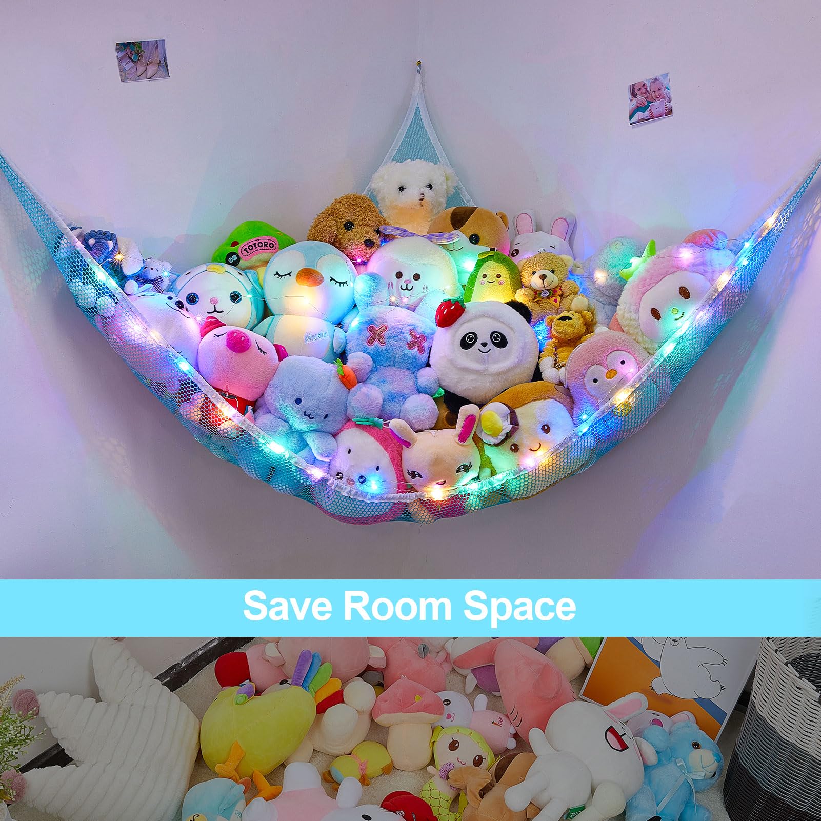 Toy Hammock: Our stuffed animals net or hammock can be a decoration for your kidsroom; Come with LED light, can add a cozy and fun atmosphere