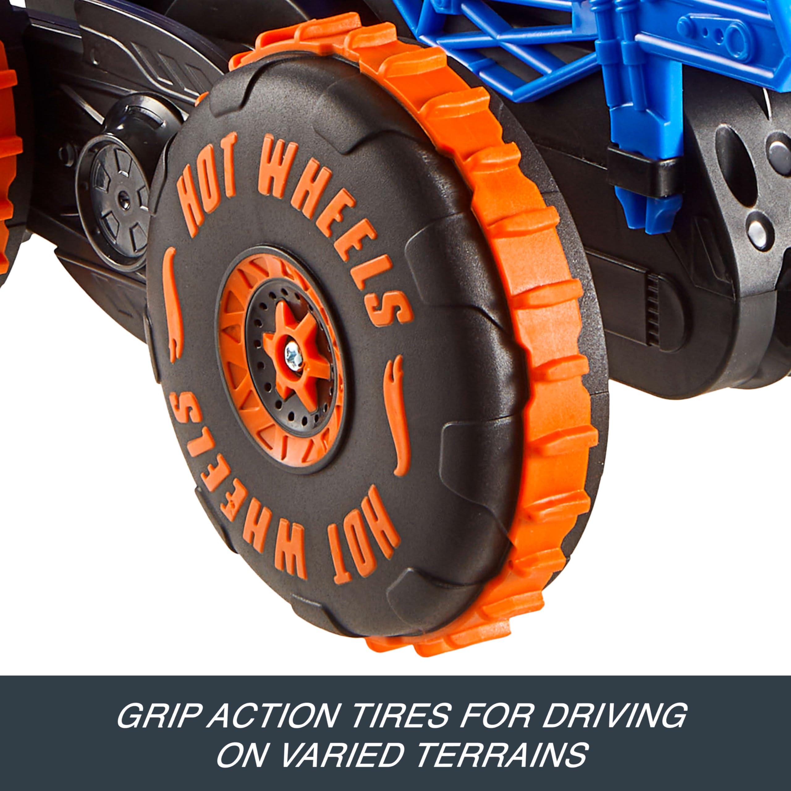 The Hot Wheels Monster Trucks Tiger Shark Climber RC is ready to smash, crash and climb It features multi-terrain capabilities with an innovative tail that helps the beast climb over obstacles and the competition. In speeder mode, it plows over assorted surfaces thanks to its Grip Action Tires. Enter climber mode to extend its tail and have Tiger Shark scale obstructions like a champ. Push a button on the remote to send it spinning into a frenzy, showing off its speed and style. Colors and decorations may vary.
