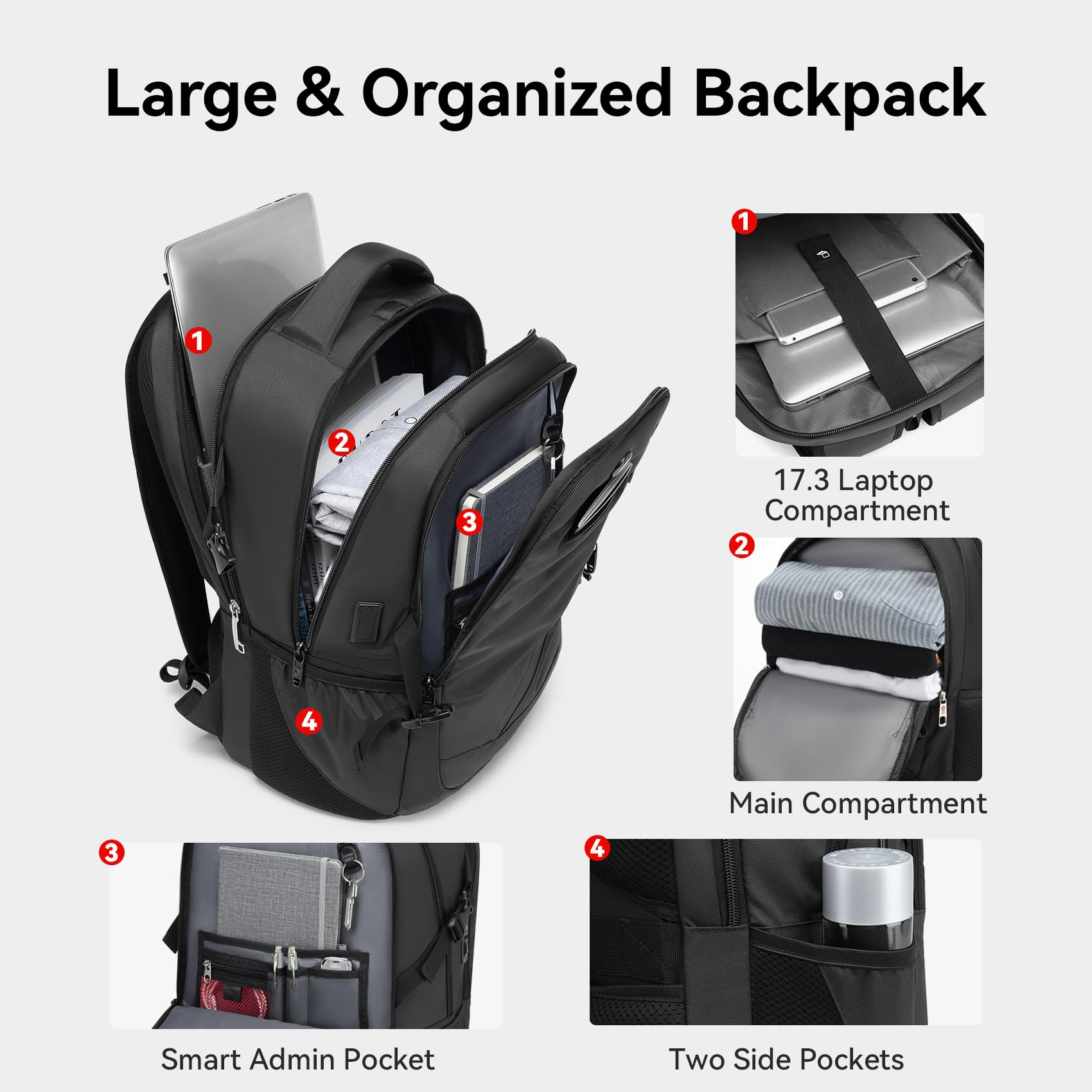 【25L Large Capacity & Smart Organization】This large mens travel backpack features a dedicated laptop compartment, fits up to a 17.3” laptop and 11'' tablet, 3 main compartments plus 10+ pockets in total, including pen holders and a key hook. Ideal as a computer backpack for men, it easily carries everything you need for work or a 2-day trip. Two side pockets fit large water bottles or umbrellas.