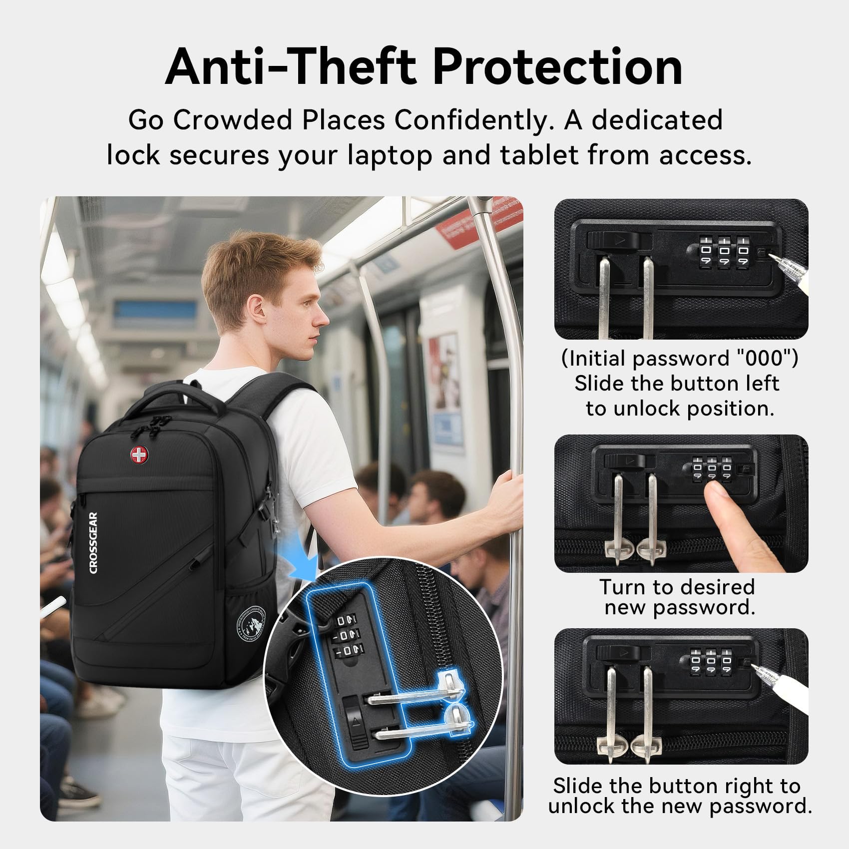 【Anti-Theft Lock Design for Tech Security】Features a built-in combination lock (default: 000) at this laptop backpack for men to protect your laptop and tech from theft. 6mm padded compartment with fixed strap effectively providing cushioned protection for your laptop. A hidden back pocket keeps your wallet, passport, and essentials secure—making it a reliable business backpack for men and a smart choice for commuting or travel.