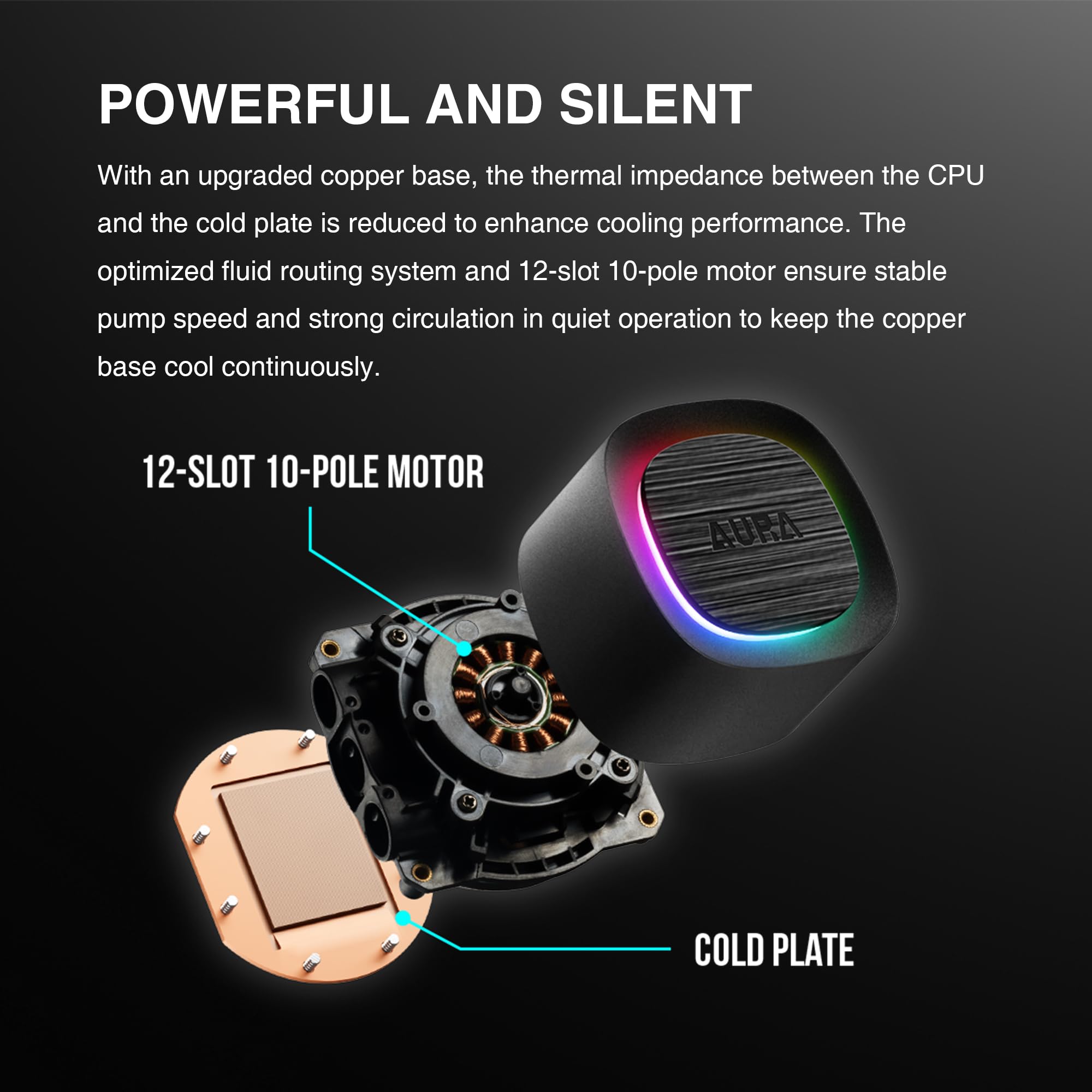 Powerful & Silent Pump: Enhanced copper base and optimized fluid routing boost cooling efficiency, while a 12-slot 10-pole motor delivers strong, stable circulation with whisper-quiet operation.