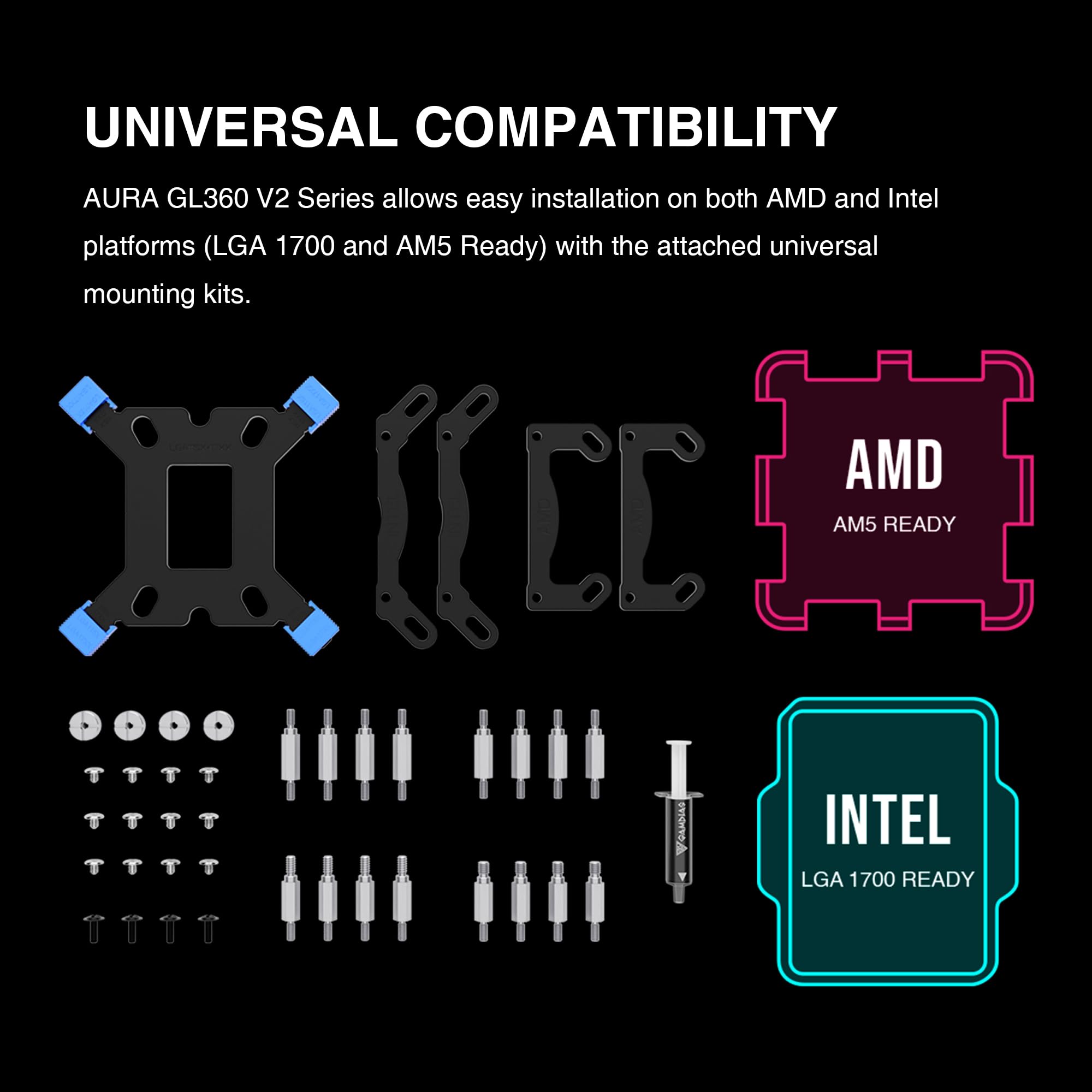 Universal Compatibility: AURA GL V2 Series allows easy installation on both AMD and Intel platforms with the attached universal mounting kits. (Intel LGA 20XX/1851/1700/1200/115X, AMD AM5/AM4/AM3)