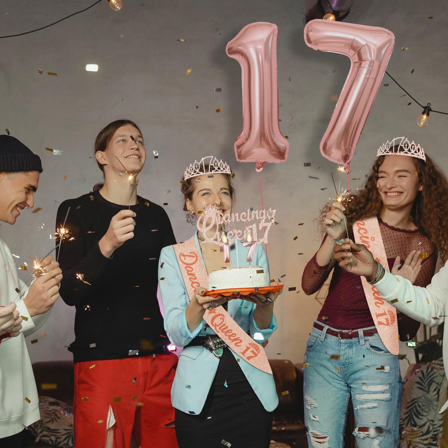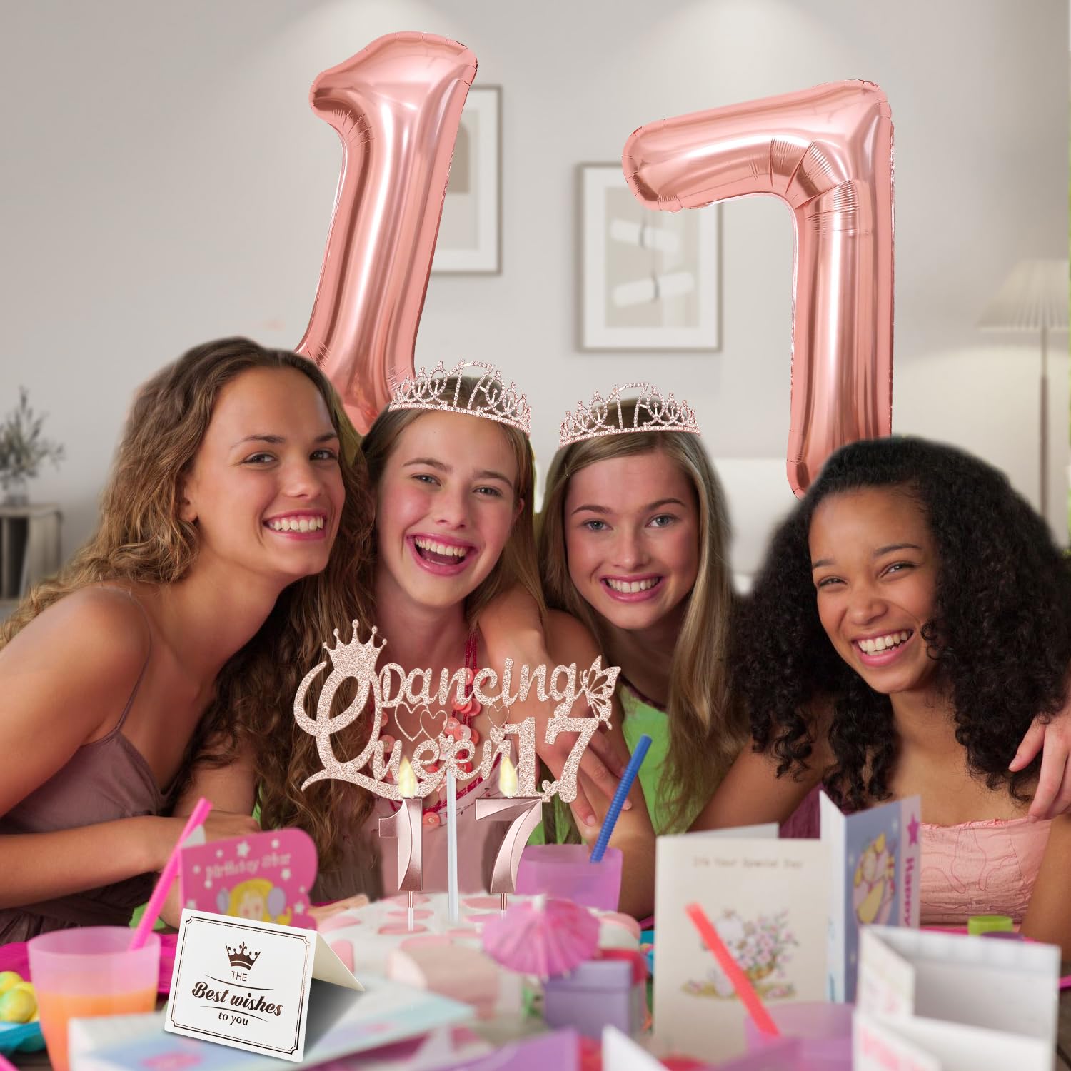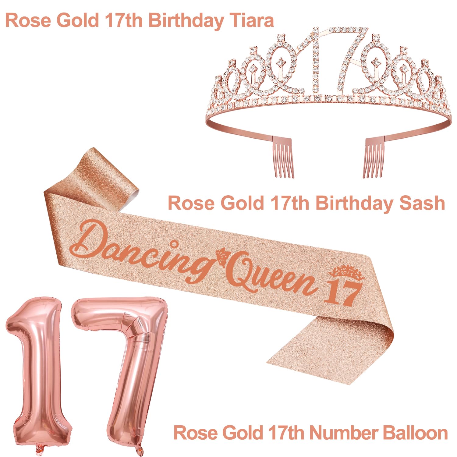 [17th Birthday Deocrations Set]: Package coming with Rose Gold Glittery Rhinestone 17th Birthday Tiara/Crown x 1pc, Rose Gold Dancing Queen 17 Sash x 1pc, Dancing Queen 17 Cake Topper x 1pc, Rose Gold Number 17 Candles x 1set, Big Rose Gold Number 17 Balloons x 1 set, Birthday Card x 1pc. This great valuable 17th birthday gift for girls has been packed in a beautiful gift box for ready presentation