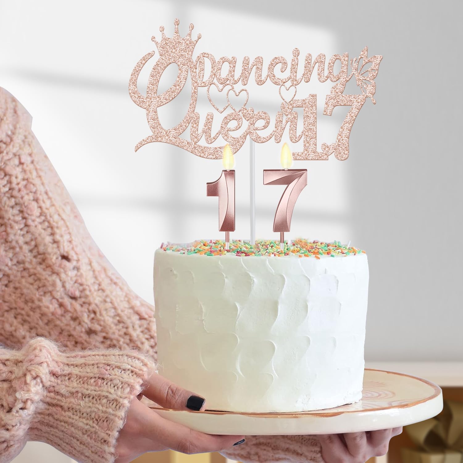 [17th Birthday Cake Topper and Candles]: 2 pieces Numeral Candles Rose Gold in number 1 and 7 which are packaged in separate plastic boxes. A Rose Gold Dancing Queen 17 Cake Topper is a funny choice for your party cakes. They are good to embellish your cake and cupcake. Bright glow for creating romantic atmosphere and adding much fun in your 17th birthday party