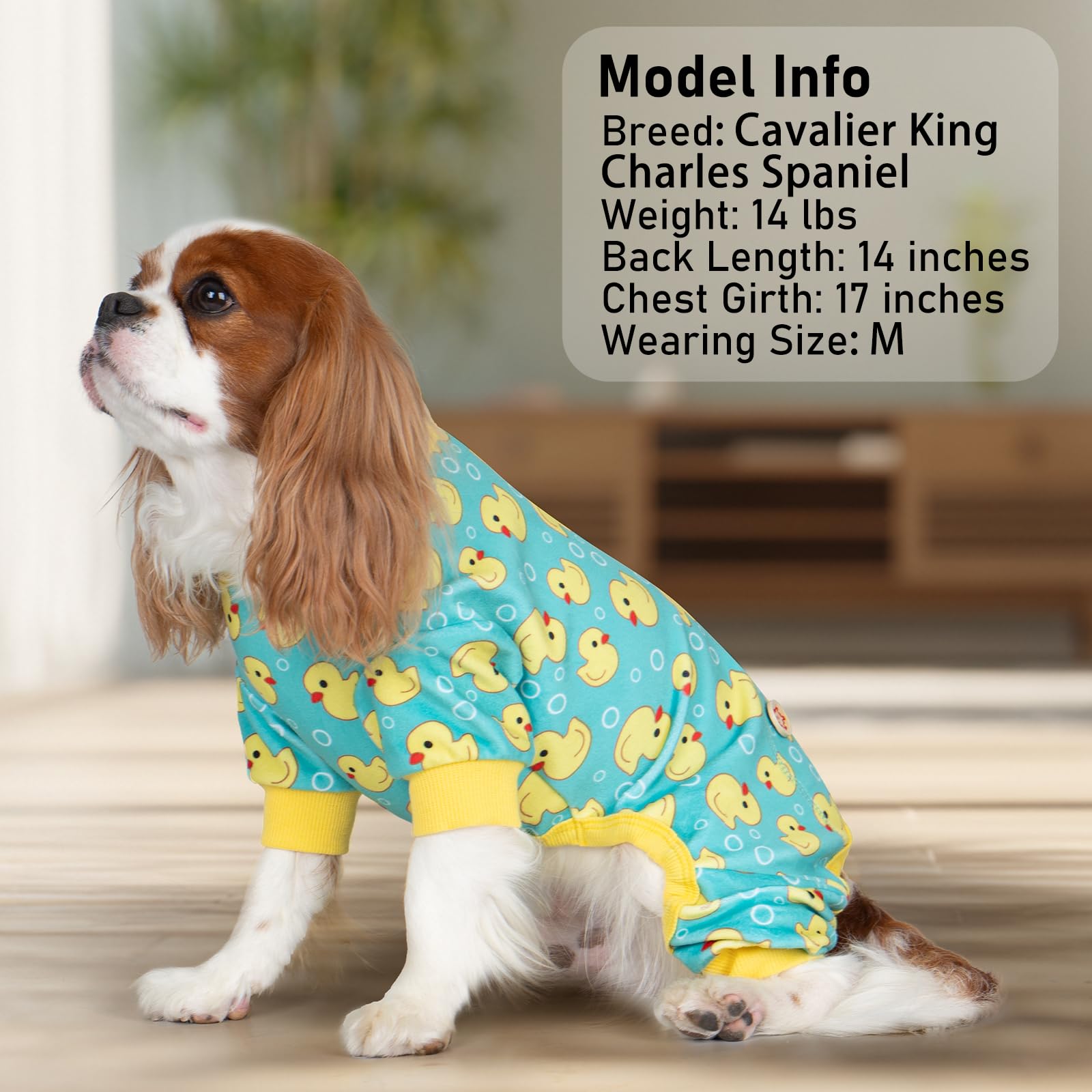 Dog pajamas in yellow duck printing, is made of soft stretchable velvet, very comfy for your dog's dailywear. Pullover design dog pjs, easy to put on and off