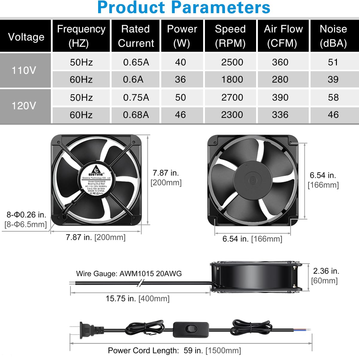 AC Axial Fan 2060: 200 mm x 200 mm x 60 mm (7.87 x 7.87 x 2.36 inches) | Hole to Hole Distance: 6.54 x 6.54 inches (166 x 166 mm) | 110 to 120V AC, 50/60Hz | Rated Current: 0.6 A to 0.68A | Noise: 54 to 56 dBA