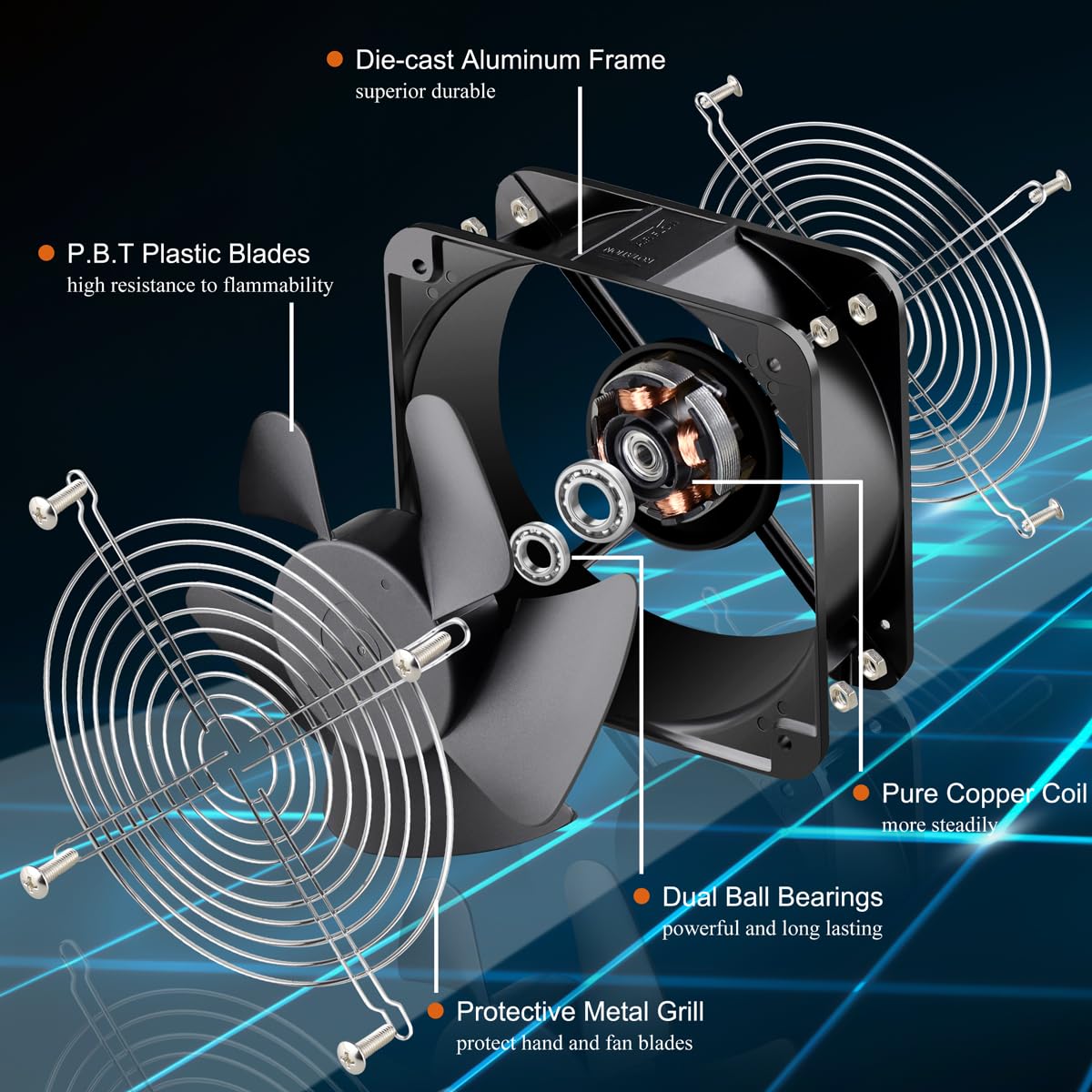 Heavy Duty Build: 200mm constructed of Die-cast aluminum Frame and suitable for various environments; Its PBT plastic impeller and Blades are well balanced; Long-lasting Dual Ball Bearings ensures the fan rated at up to 67,000 hours allows the fans to be mounted flat or upright