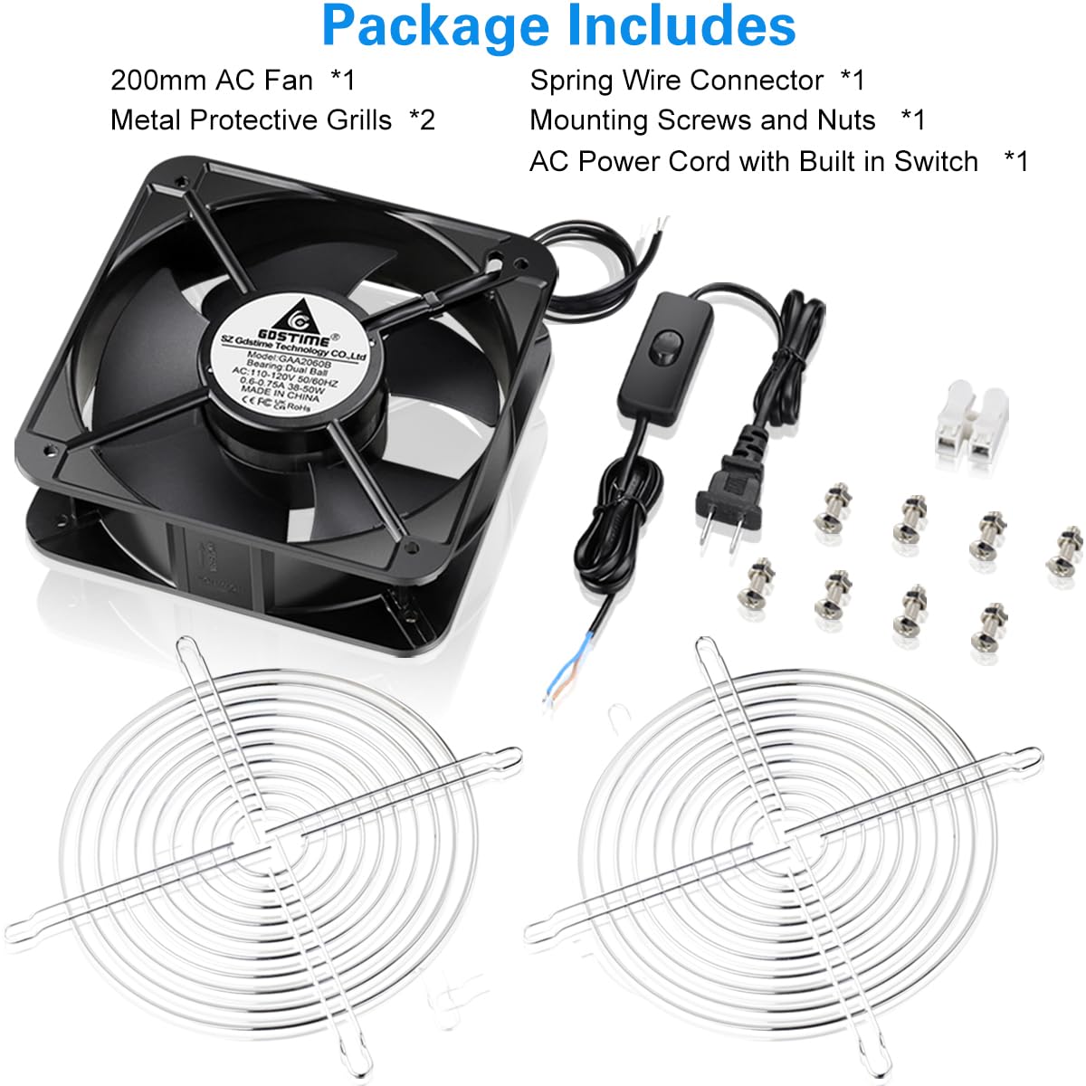 In the Box: Includes a Heavy-duty aluminum Fan 200mm; a AC Plug Power Cord with ON/OFF Swtich; Spring Wire Connector and Mounting Screw Set, Two 200mm Metal Fan Guards (offer excellent protection and reliably avoid you from accidentally touching the running fan or cables from being pushed into the impeller)