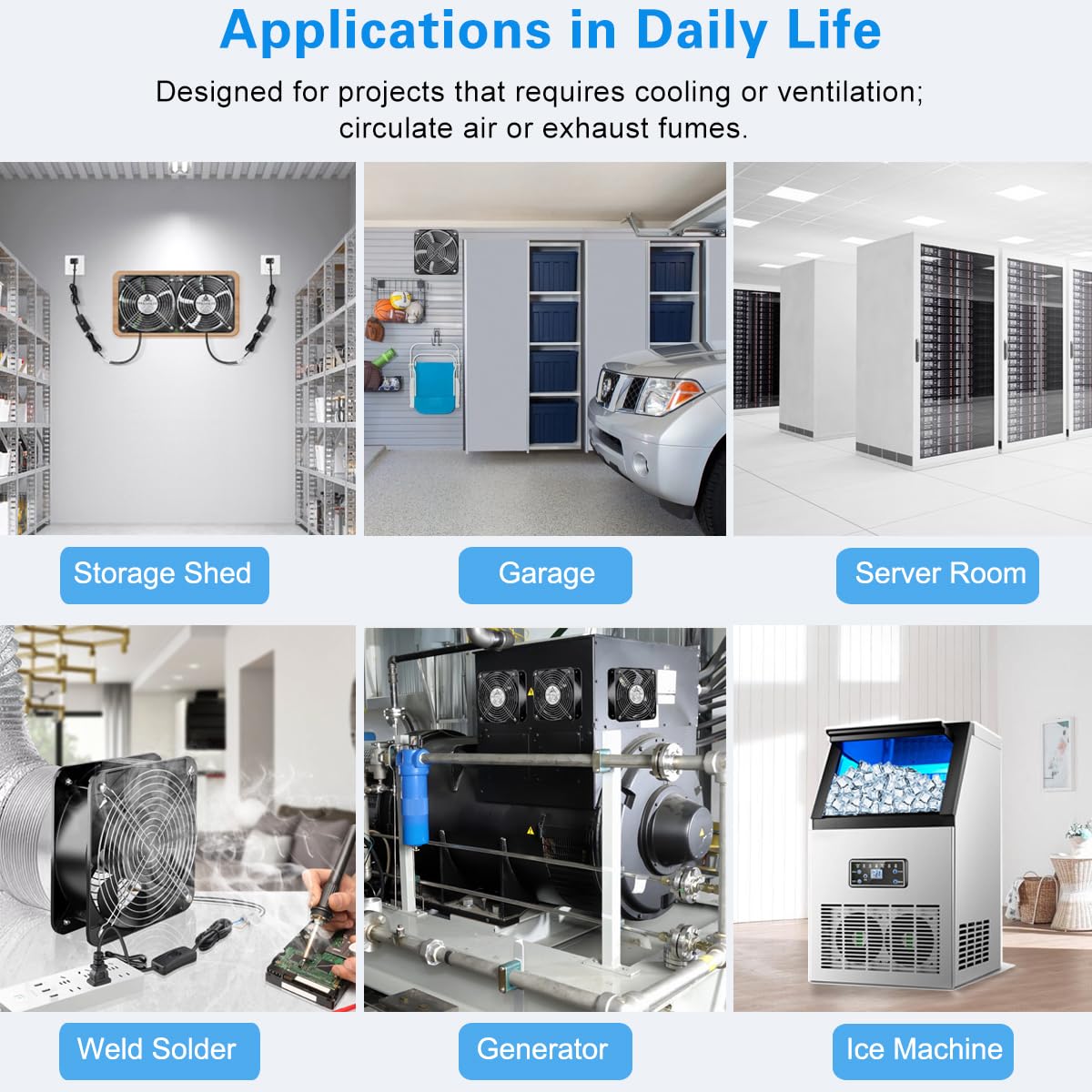 Wide Applications: The heavy duty axial fan kit is suitable for various projects that requires cooling, exhaust or ventilation; or as a replacement fan for Air Hockey Table; Widely usd in Generator Box, Air Compressor, Small Storage Shed, RV Fridge, Ice Machine, Network and Server Cabinet, Laser Cutter, Smoking Conner, Small Greenhouse, Vacuum Pump Enclosure, etc
